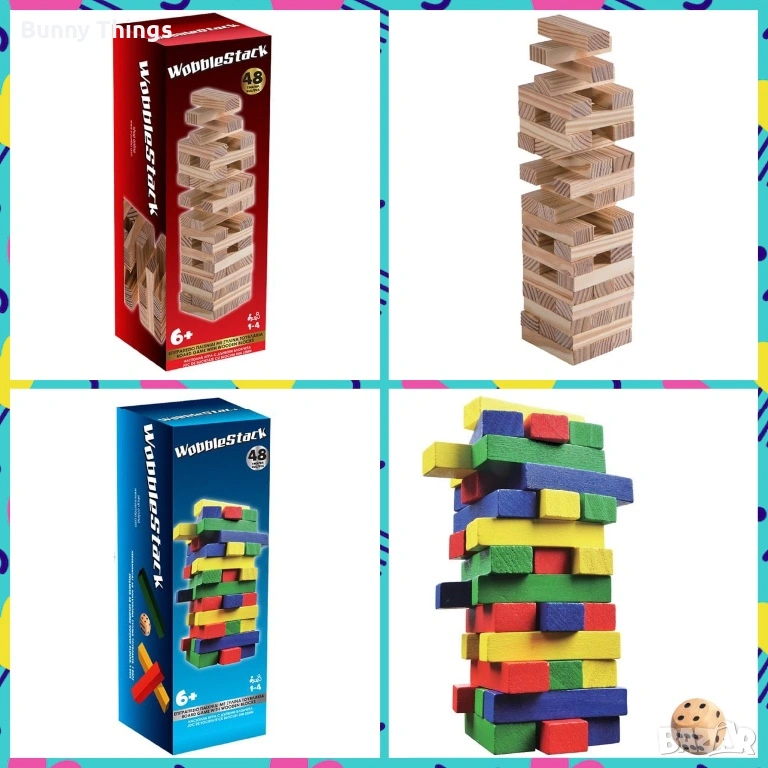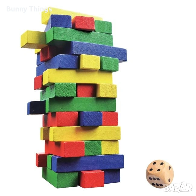 Настолна игра Tumblin Tower. Опаковката съдържа 48 цветни тухлички, зарче и инструкции. За 1–4 играчи.