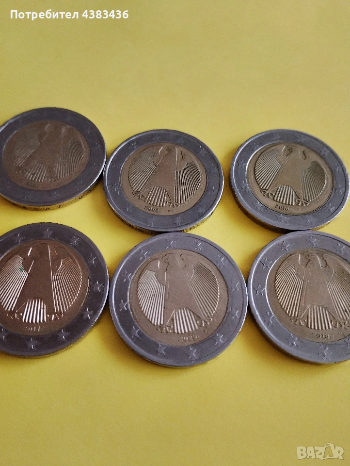 Германски монети от две евро на тях е изобразен орел от 2002г с букваА .2002г с буква Д.2016.2017.2019.2020г