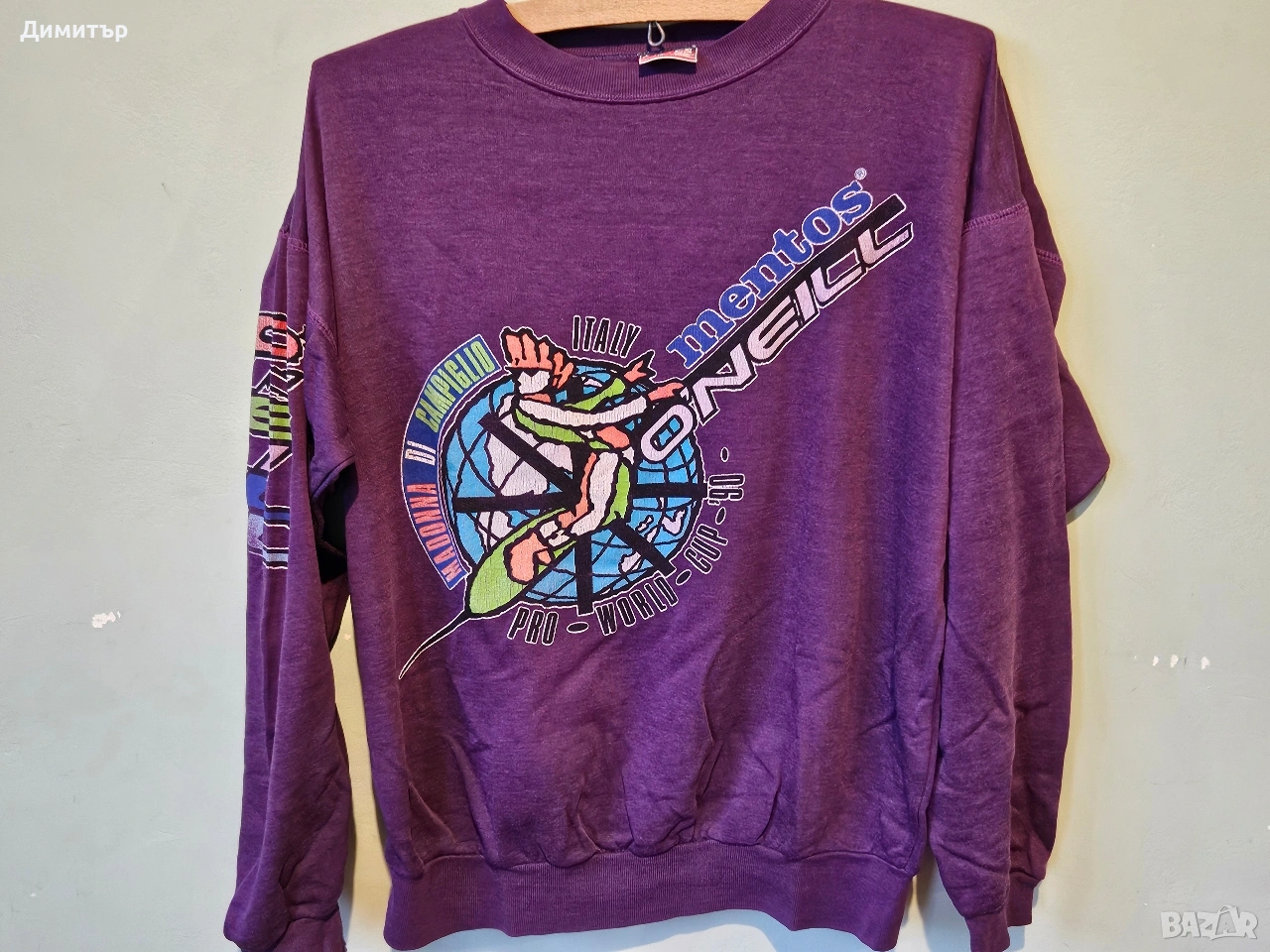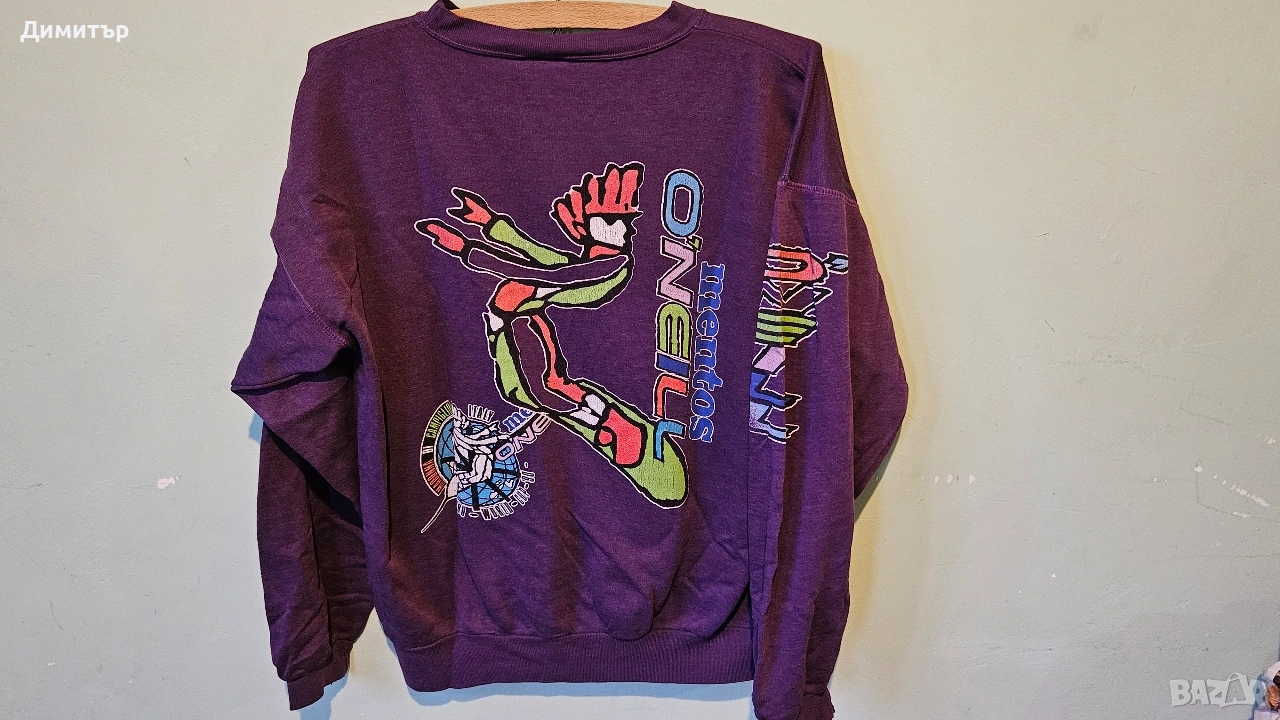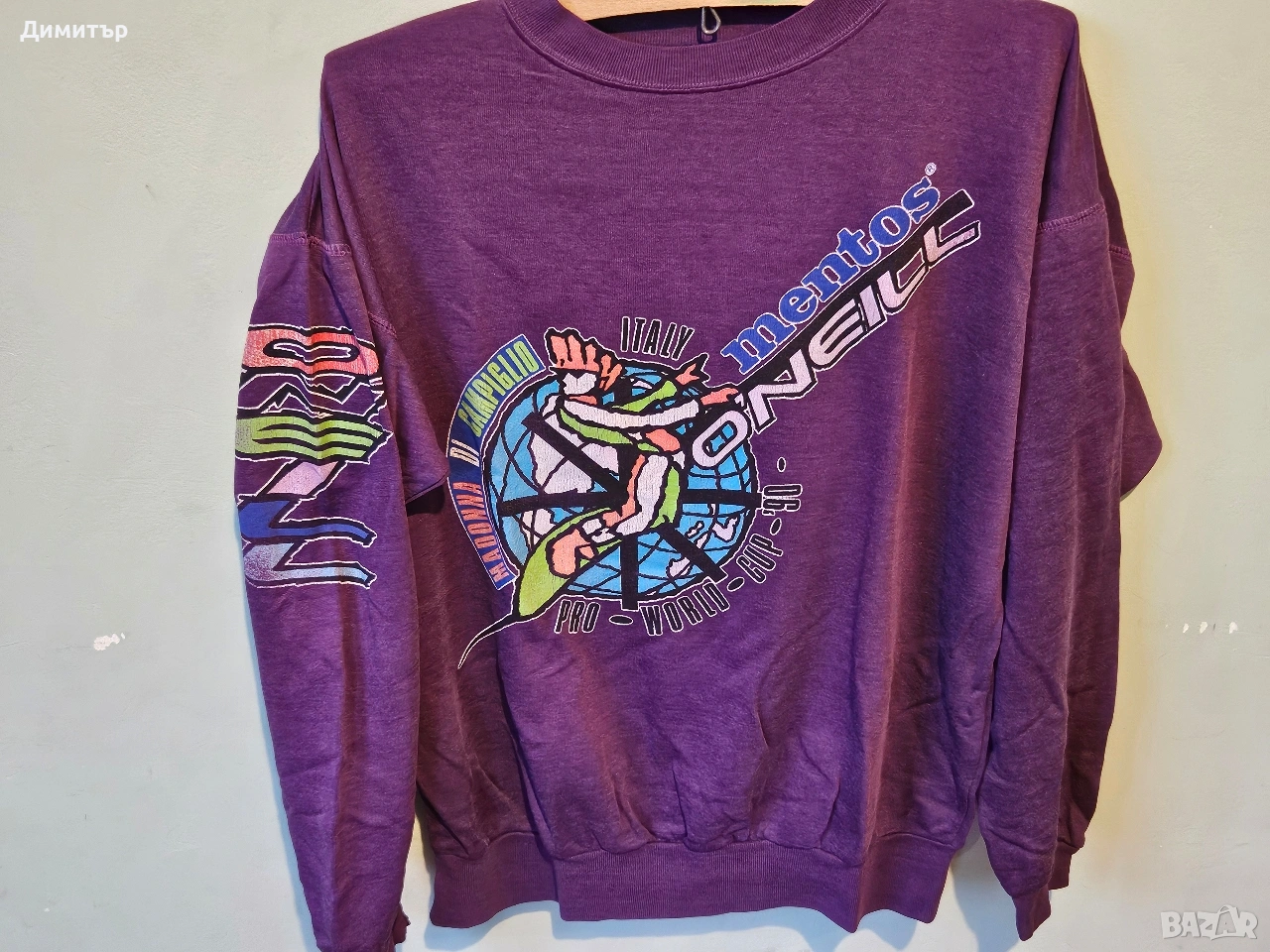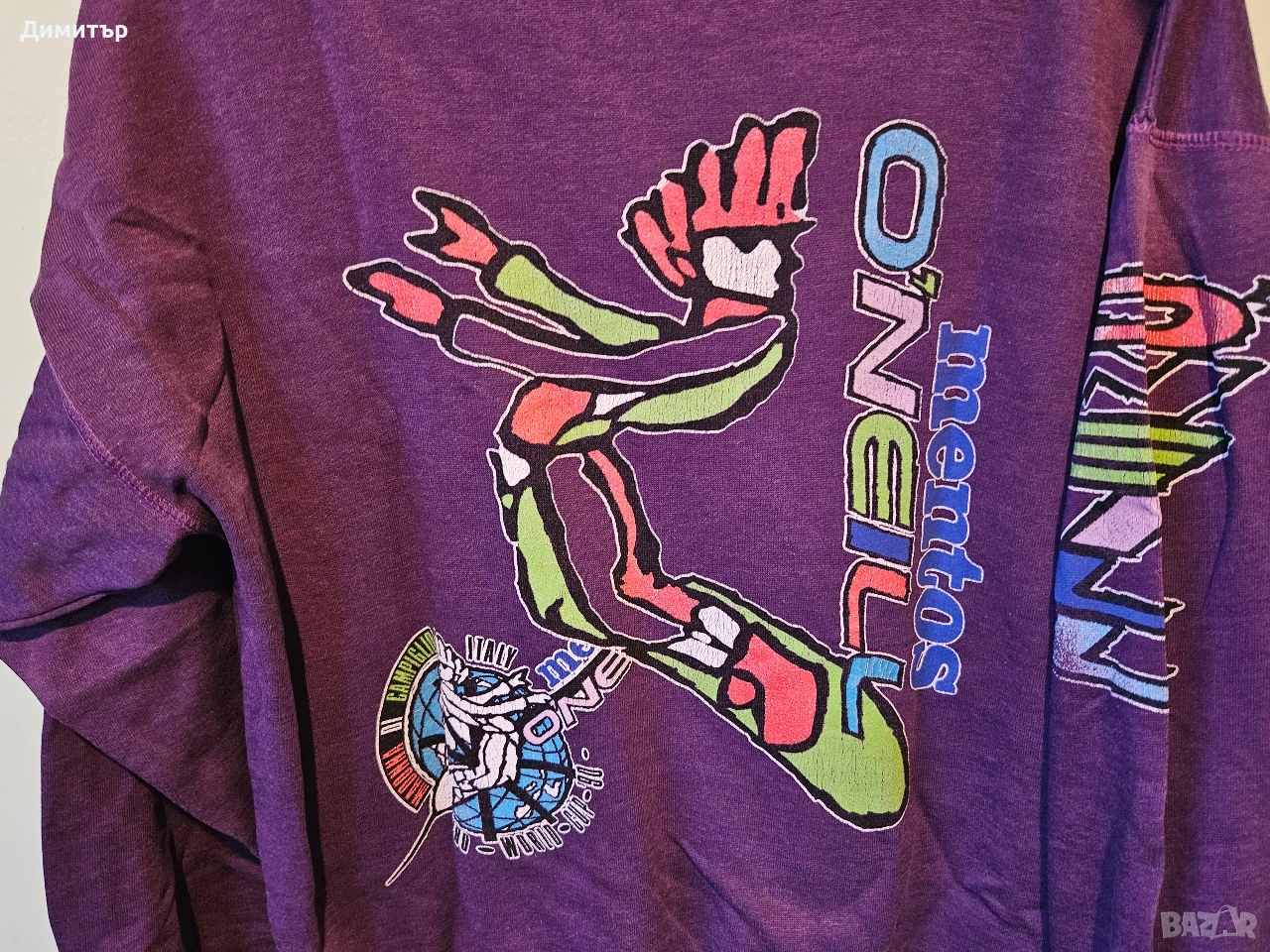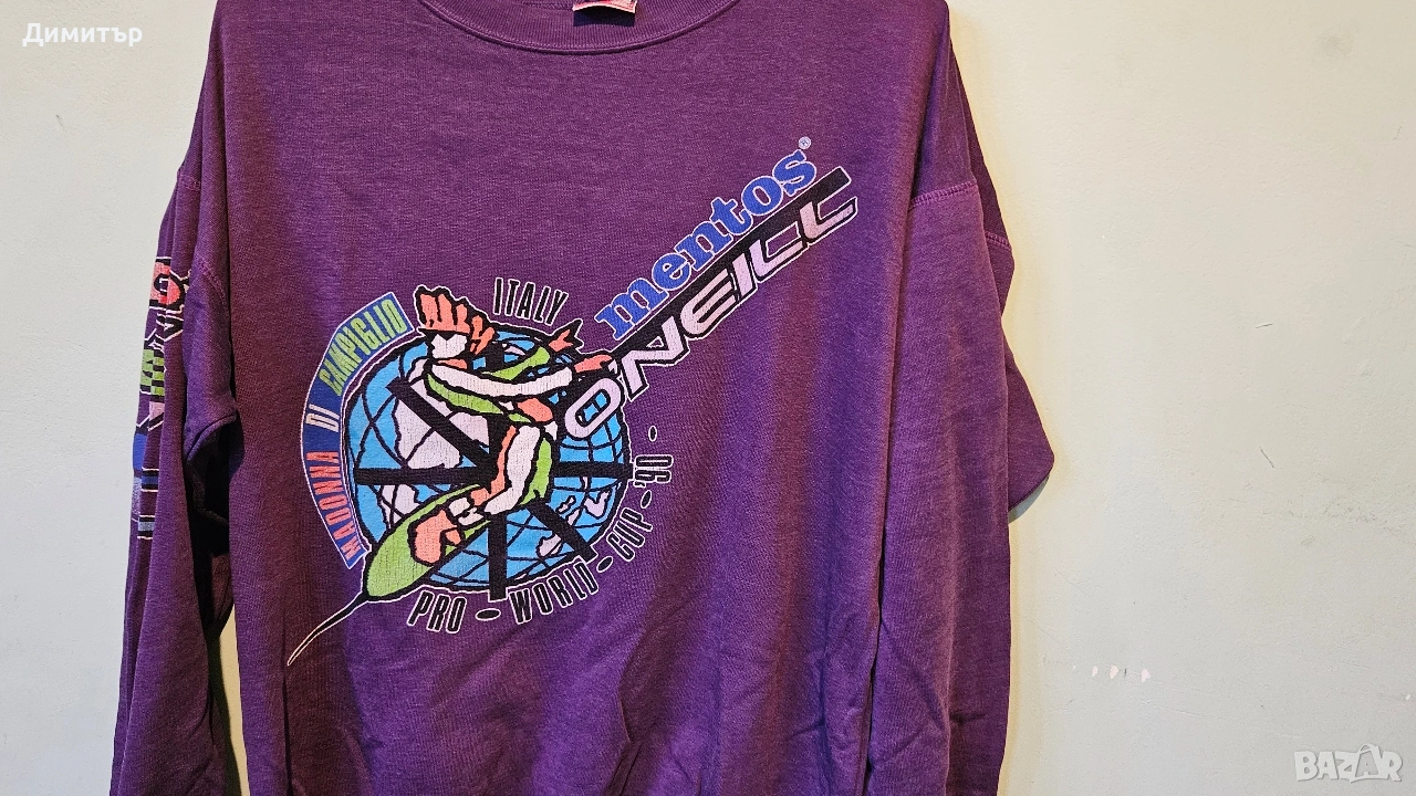 Здравейте, продавам тази рядка ретро блуза на Mentos и O'neill world cup snowboard Italy 1990.