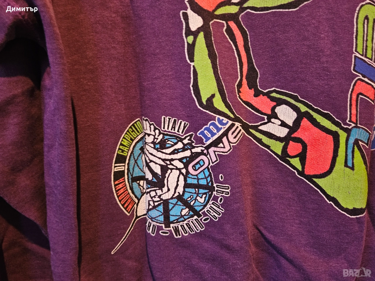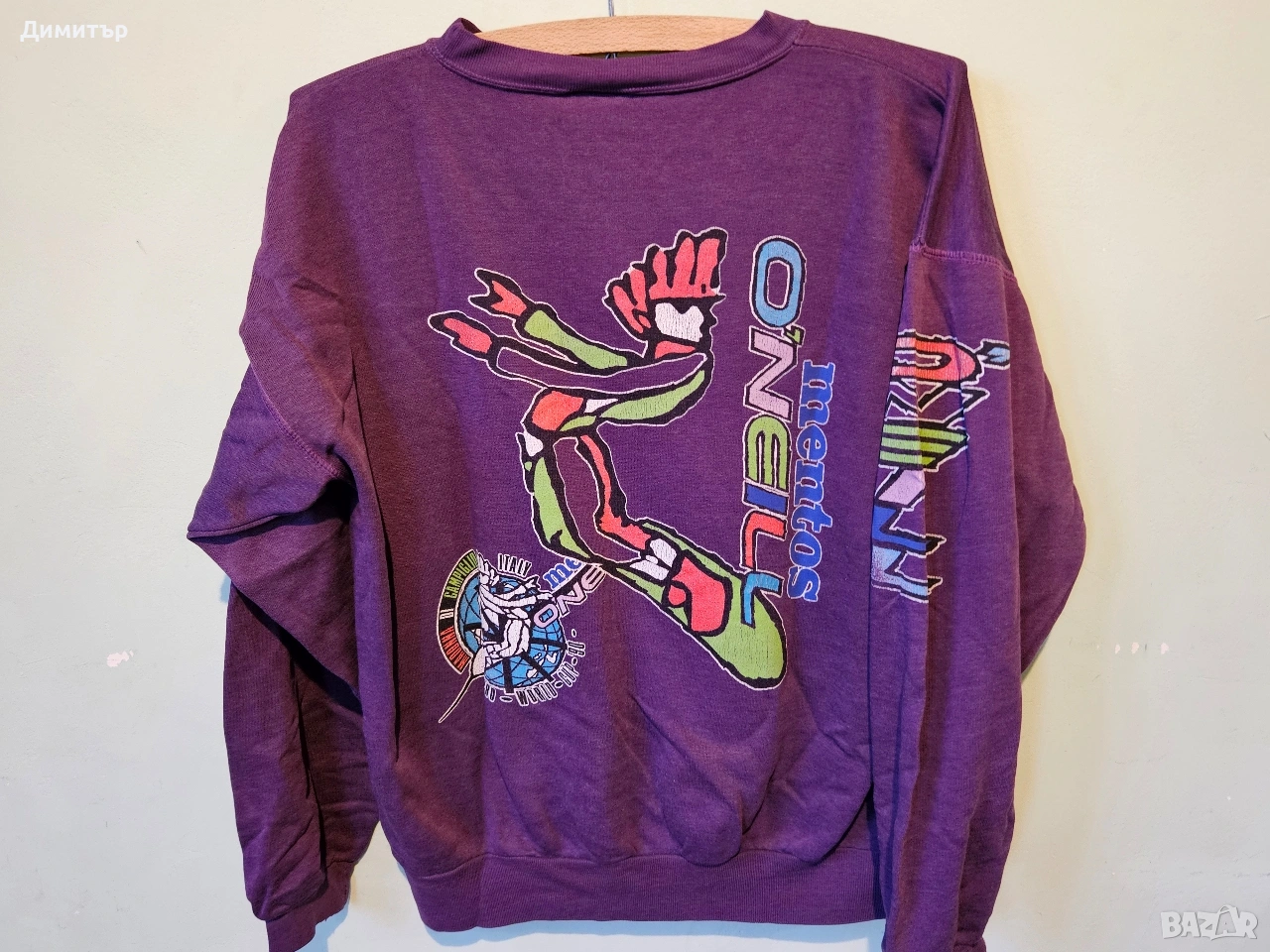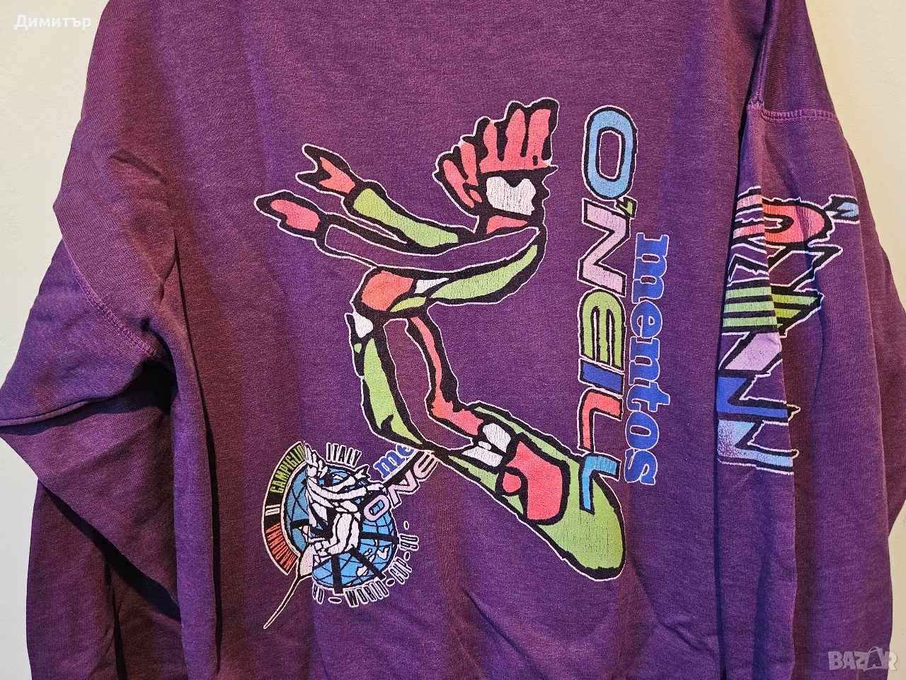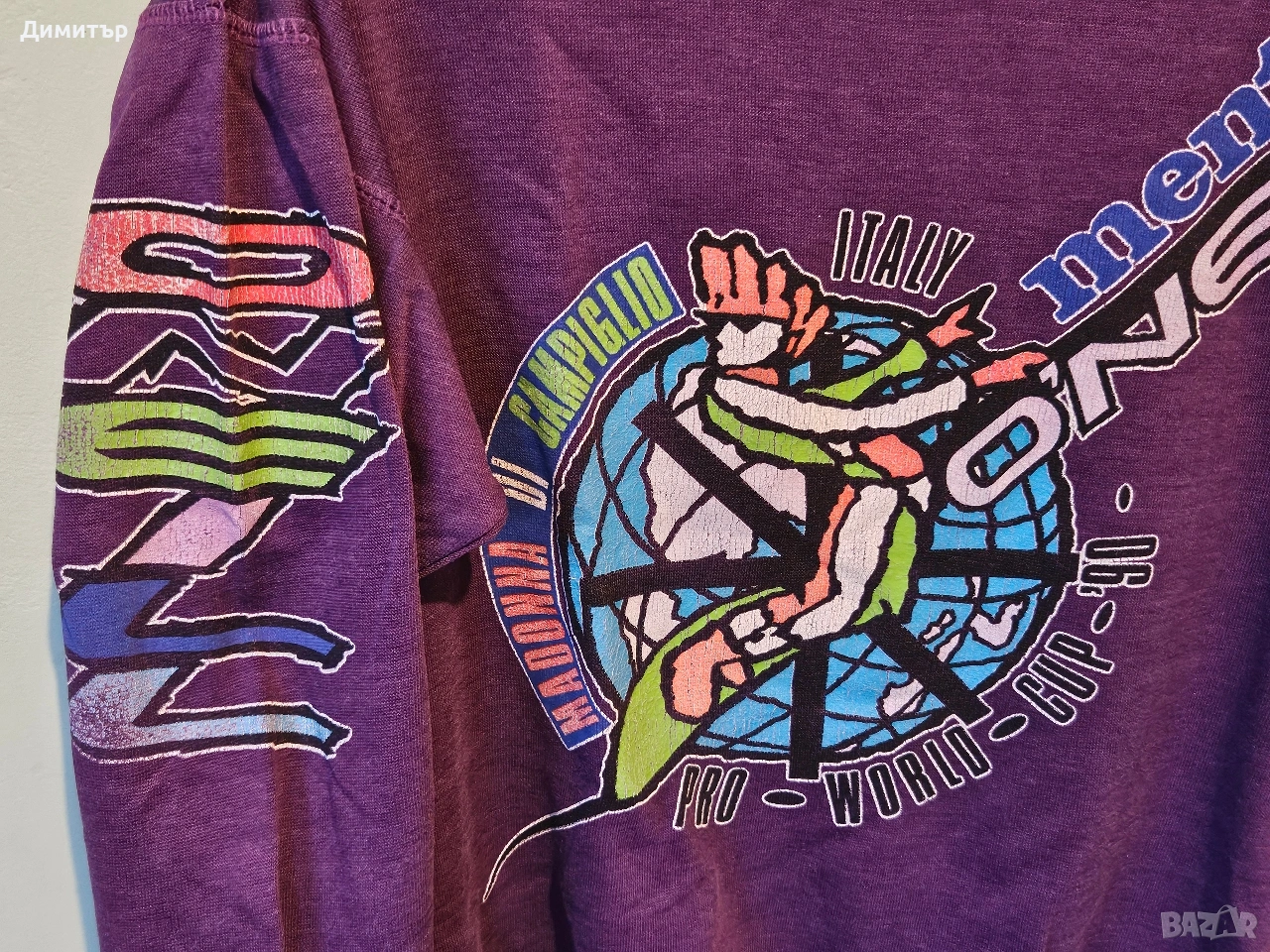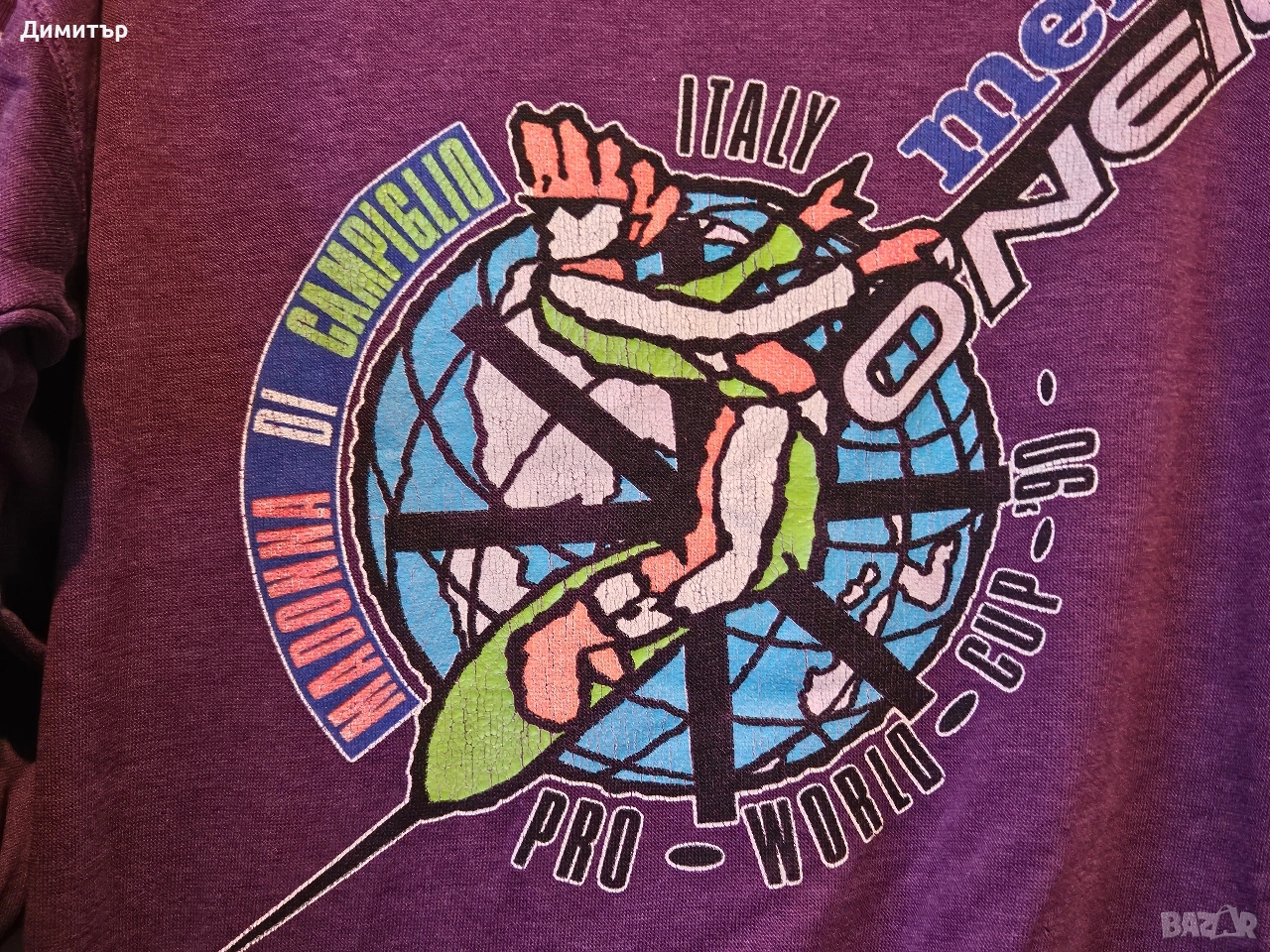 Здравейте, продавам тази рядка ретро блуза на Mentos и O'neill world cup snowboard Italy 1990.