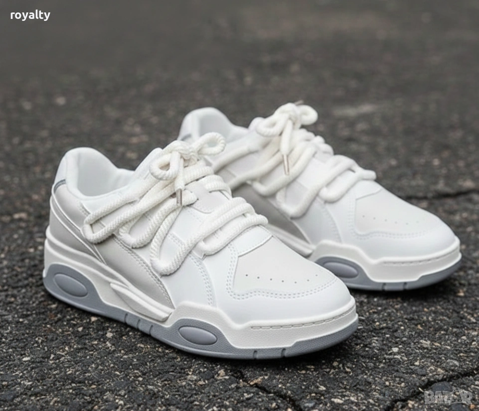 Бежови спортни обувки-тип скейтърки.Горната част е от еко кожа,вътрешната е от текстил,ходилото е дебело и стабилно.Затварянето е с връзки.