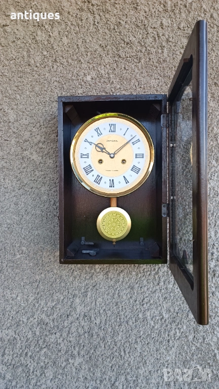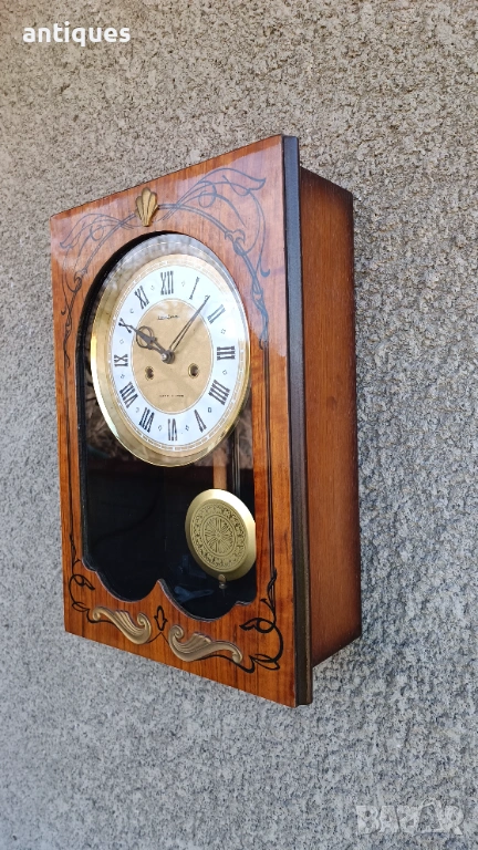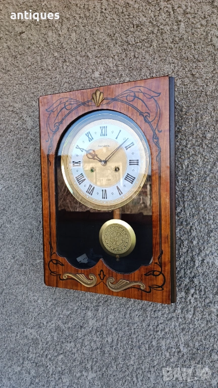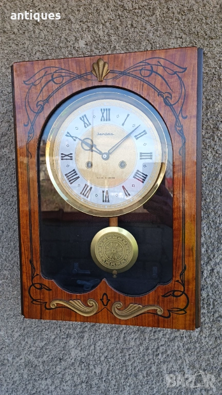 Часовника е много красив страхотна придобивка за ценители. Рядък модел с цяло стъкло и гравюри по циферблата и махалото.