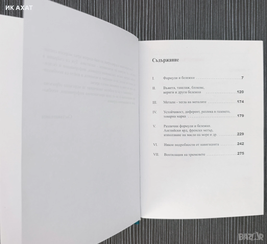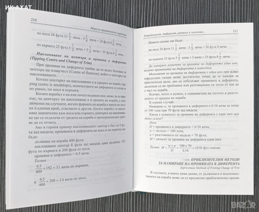 Съдържа формули, таблици, практически бележки, стабилност, диферент, газене, навигационни разчети и др.