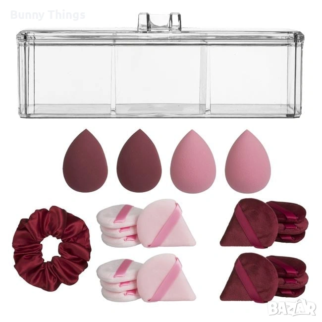 Последни бройки! Комплект за красота с прозрачна пластмасова кутия с капак и 3 отделения. Съдържа 1 сатенено scrunchie в бордо цвят, 4 гъби за грим тип капка и 8 триъгълни гъбички. Прозрачният капак позволява лесно да виждате съдържанието.