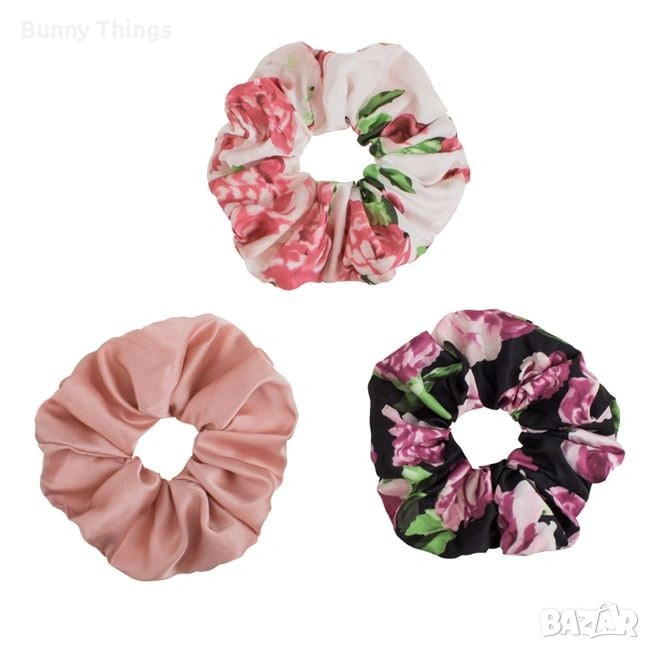 Дамски сатенени ластици за коса тип скрънци– розов с флорален десен, бял и черен. Това е аксесоарът, който ще преобрази лятната ви прическа със стил.