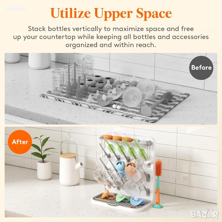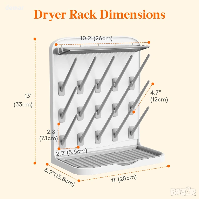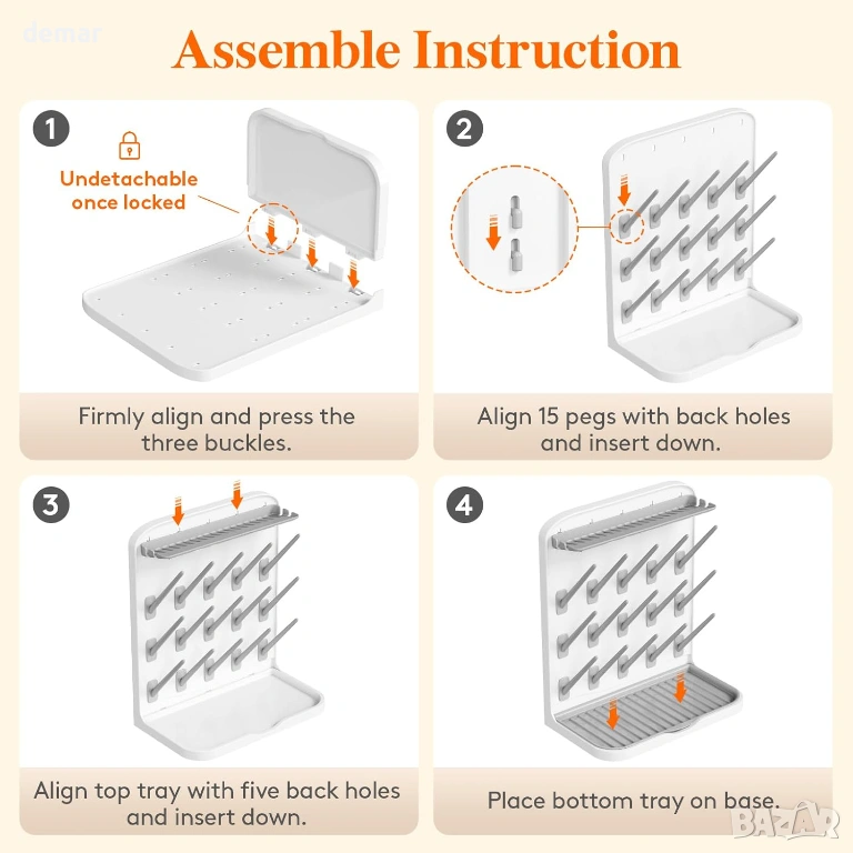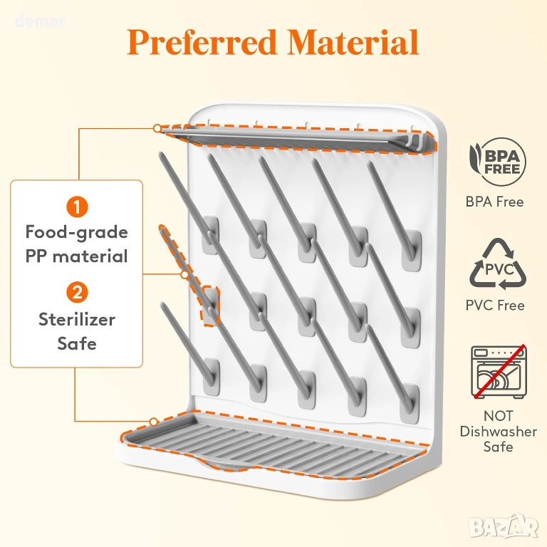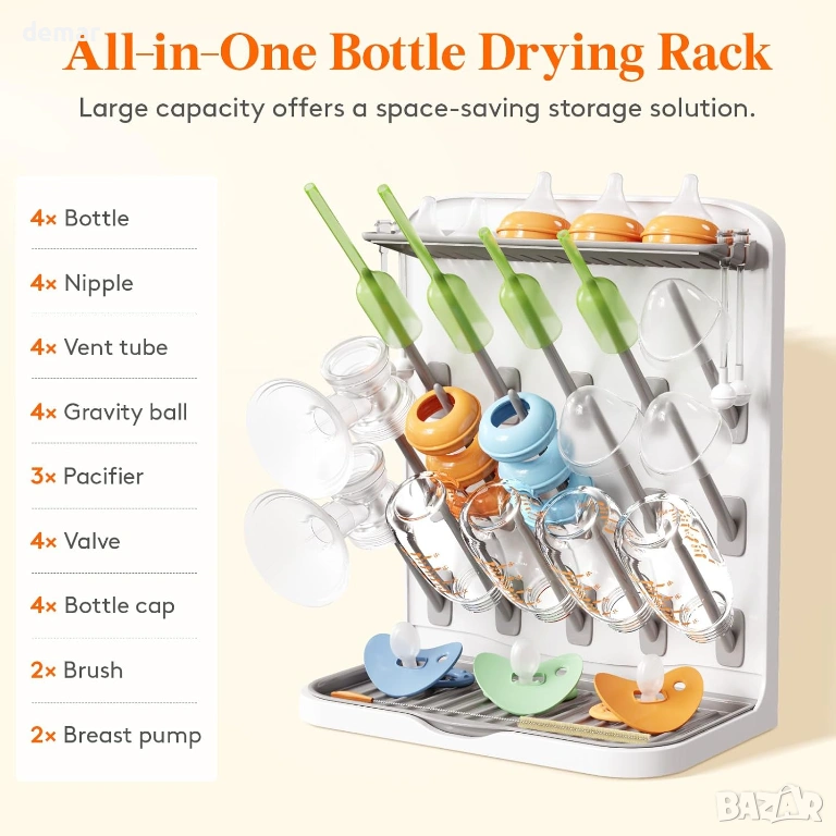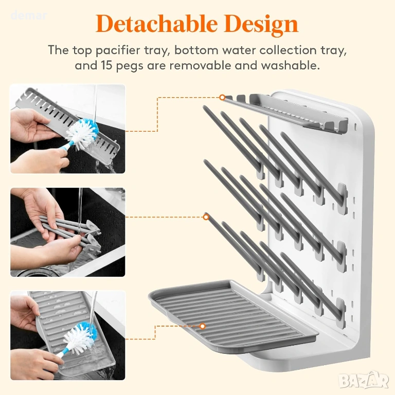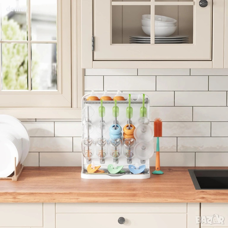 Универсална поставка за сушене на бебешки шишета с 15 подвижни щипки, предназначена за съхранение на 4–5 пълни комплекта шишета и аксесоари, включително биберони, залъгалки, сламки, капачки и части за помпа, като същевременно се увеличава максимално вертикалното пространство за организиране на плотовете. Изработени от хранителен PP материал без BPA, щипките и тарелките са подходящи за стерилизация. Подвижният дизайн включва горна тава за залъгалки, долна тава за събиране на вода за капчици, капачки и четки, както и отделна дренажна подложка за инструменти за сушене. Лесна за сглобяване в четири стъпки, тя осигурява ефективно, пестещо място сушене и подредено съхранение в една компактна конфигурация.