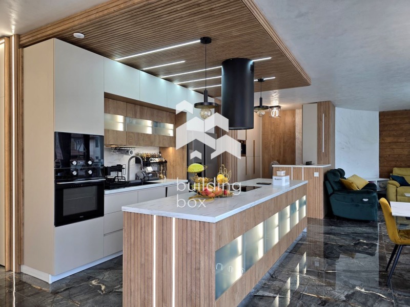 Интериорът е изпълнен с висок клас материали и детайлно внимание към дизайна. Всяка мебел е по индивидуален проект, а комбинацията от венециански мазилки, дизайнерски плочки и скрито LED осветление създава усещане за изисканост и уют.