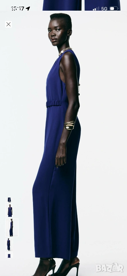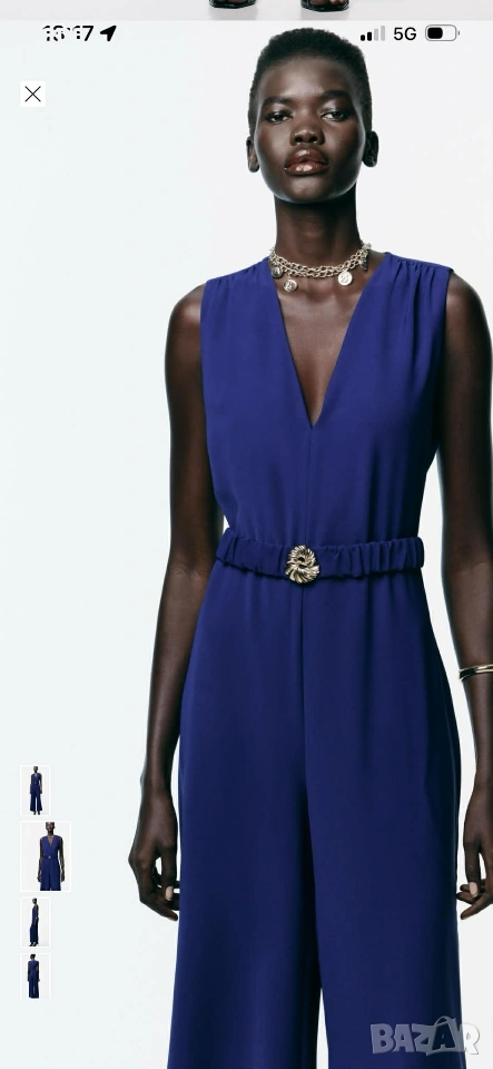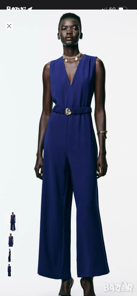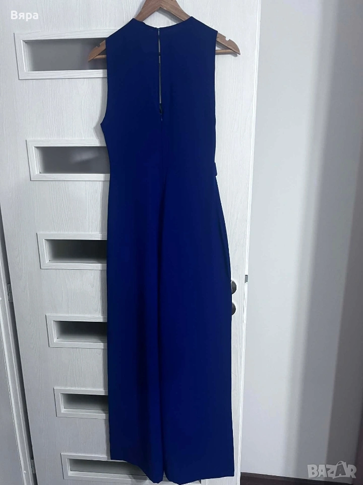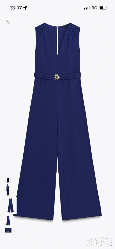 Нов гащеризон на ZARA в син цвят. Стилен и модерен дизайн, подходящ за различни поводи. Изчистен и елегантен избор за вашия гардероб.Нов гащеризон с етикетите Zara, размер ХС. V - образно деколте, еластичен колан със златни детайли отпред, широк крачол. Закопчаване със скрит цип на гърба и копче.25 евро
