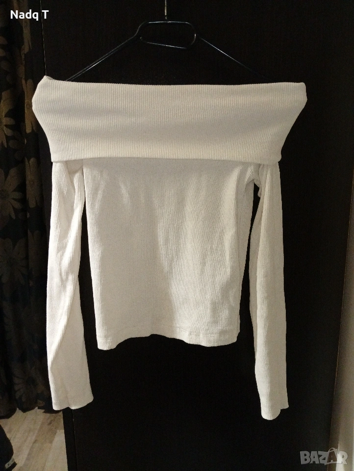 Бяла блуза с паднали рамена. Еластична материя.