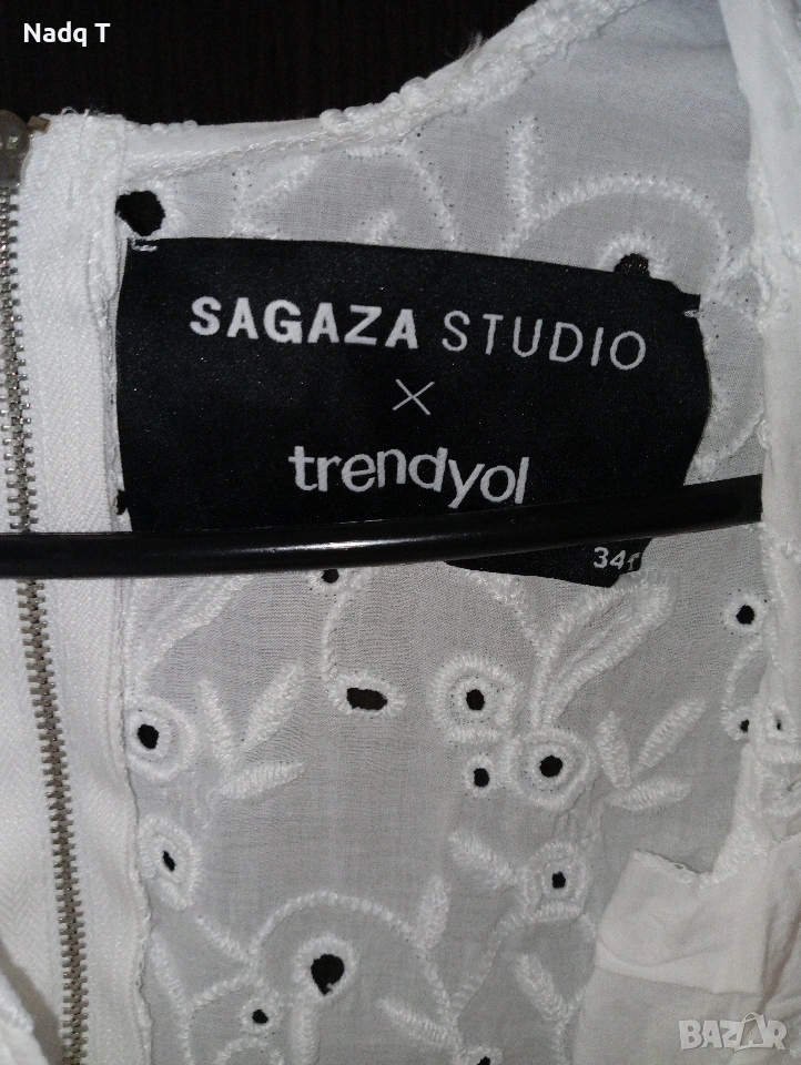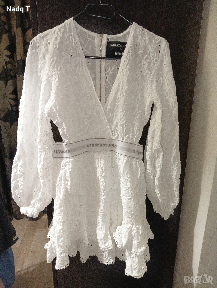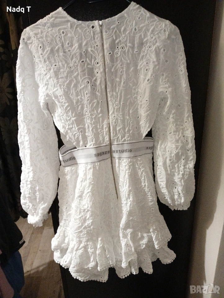 Бяла рокля. С процепи отстрани, оставила съм снимка на модел, за да се види как стои роклята. Марка Sagaza studio&Trendyol.