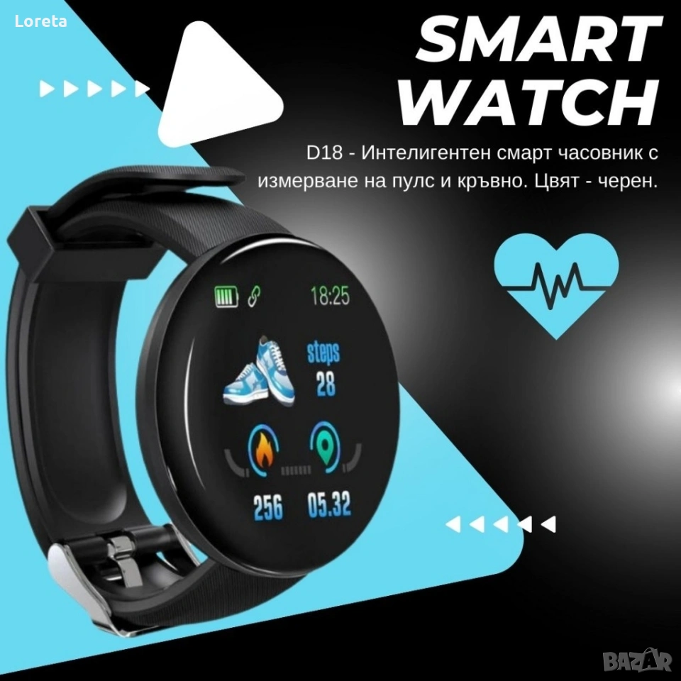 Интелигентен смарт часовник с измерване на пулс и кръвно. Цвят - черен. → Обява 53412922