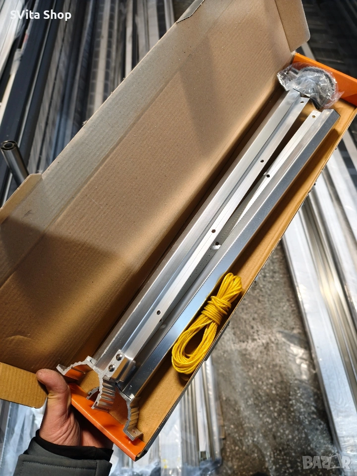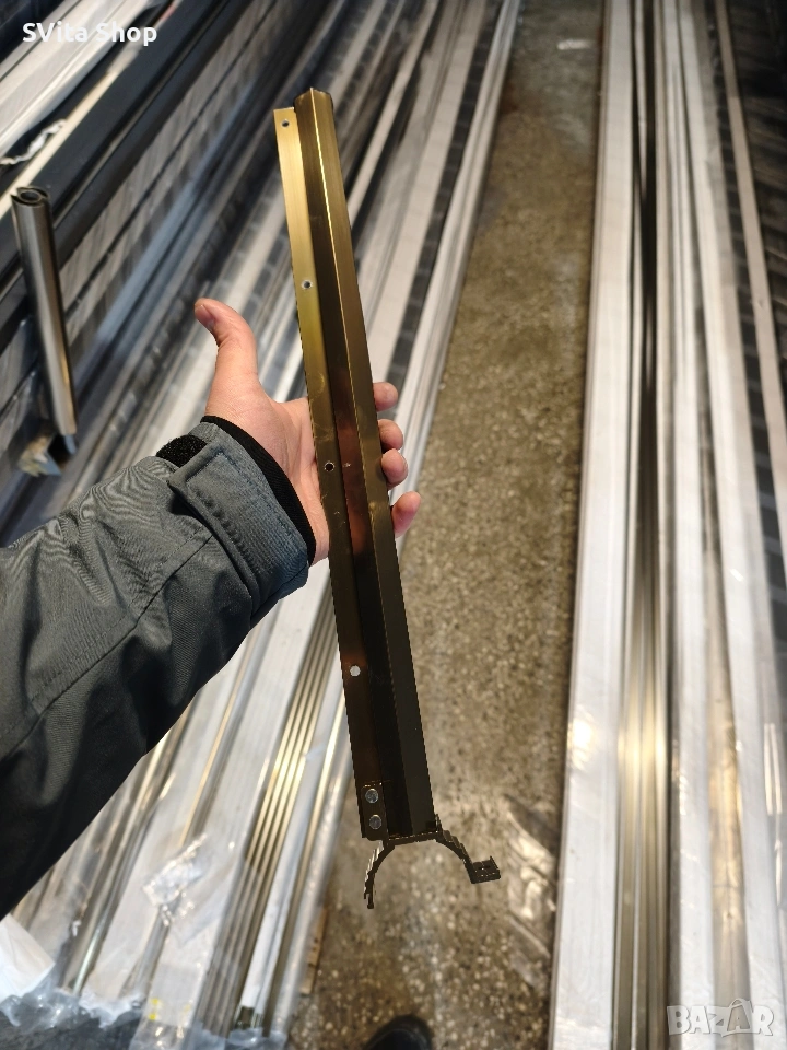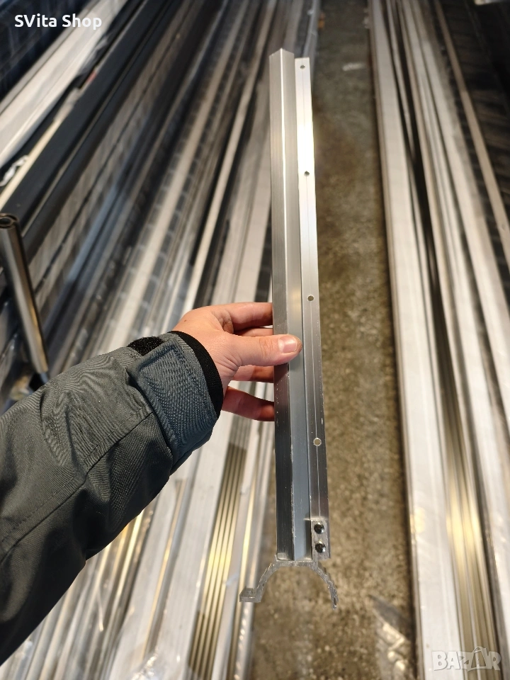 Алуминиев простор за дрехи, предназначен за монтаж на алуминиев парапет . Може да се монтира с дължина до 1,20 м. Просторът е специално изработен за алуминиеви парапети с ръкохватка Ø50, като също така позволява захващане към всякакъв вид тръба с размер около Ø50.