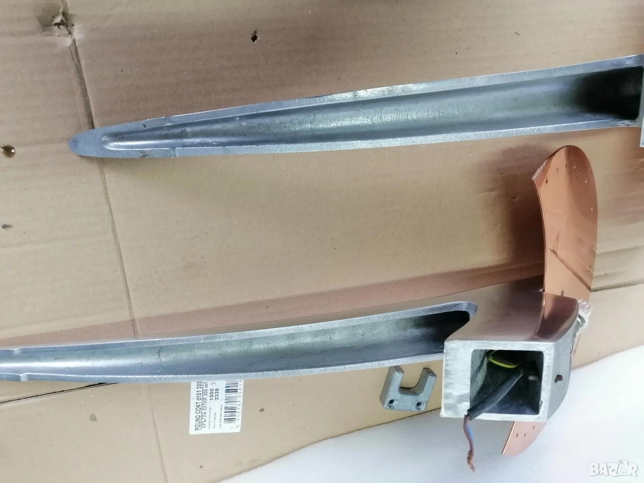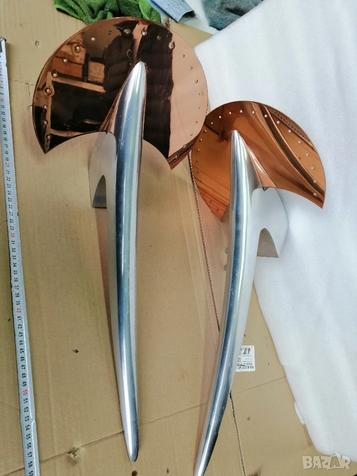 Чифт винтидж стенни лампи, проектирани от Хуан Оже и произведени от Taller Uno de Metalarte. Оригинални модели от 80-те години на миналия век в добро състояние. Материал: алуминий и мед. Следи от употреба и възраст, както се виждат на снимките. Цена за чифта: €250.