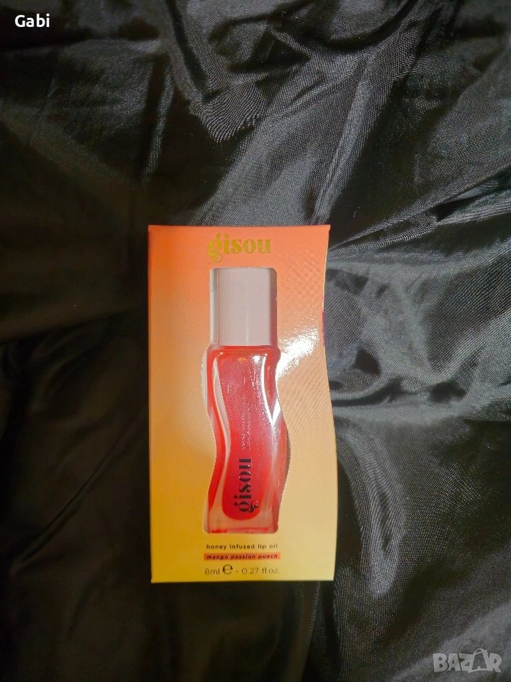Gisou Honey Infused Lip Oil в лимитирания нюанс Mango Passion Punch (8 ml). Това е хидратиращо масло за устни, което съчетава грижа и блясък.
