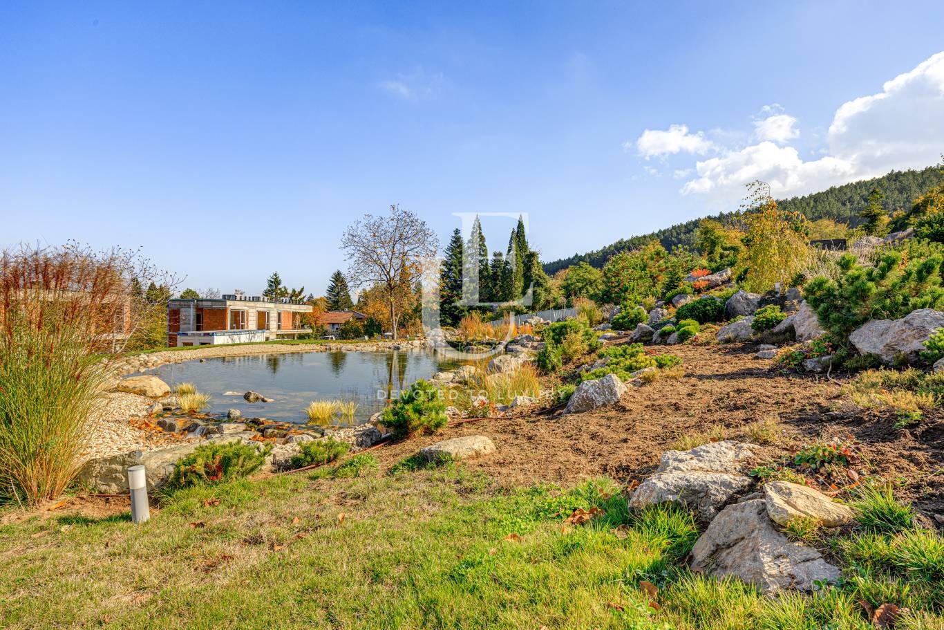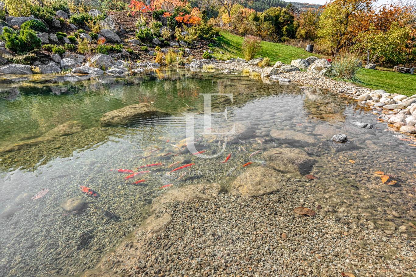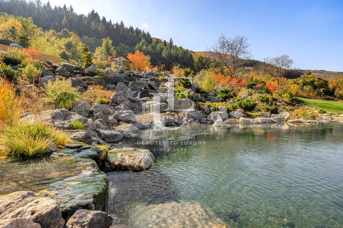 Общата площ на имота впечатлява със своя мащаб и концепция. От тях пет декара са завършени с изящно озеленяване, включващо езеро, малка река и живописен водопад, които създават усещане за истински оазис. На територията е изградена и сауна с панорамен изглед, предлагаща пълен релакс в прегръдките на природата.