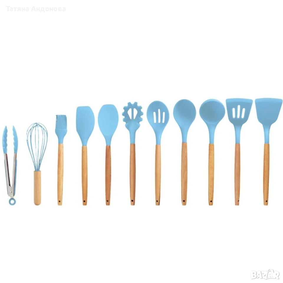 Комплект 12 части кухненски прибори със стойка Cheffinger- силиконови накрайници , дървени дръжки → Обява 53413645