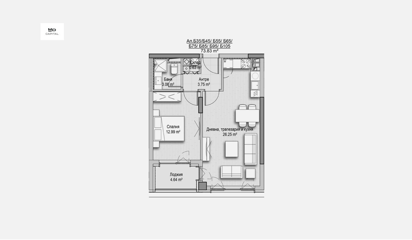 Апартамент Б55 се намира във вход Б на етаж 5. С обща квадратура 73,83кв.м.