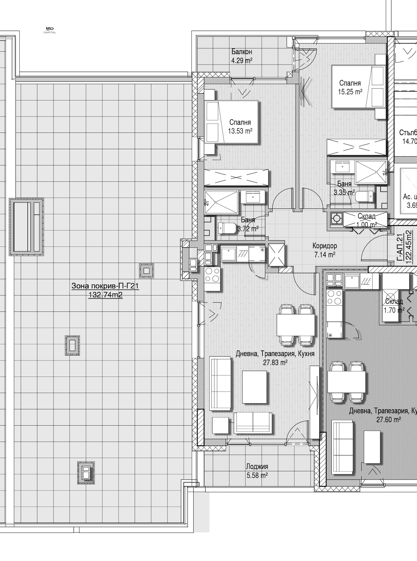 Апартамент Г-АП.21 се намира във вход Г на етаж 7 над Партер. С обща квадратура 122,45кв.м. и 132,74 кв.м. покривна тераса.