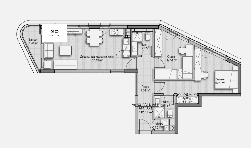 Апартамент A71 се намира във вход А на етаж 7. С обща квадратура 117.11 кв.м.
