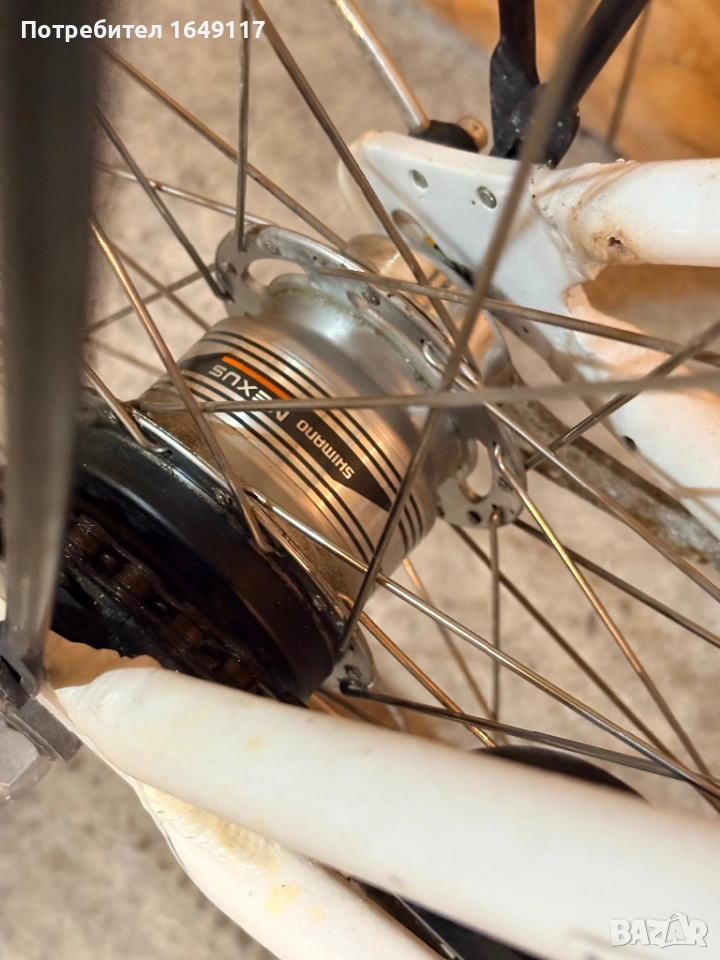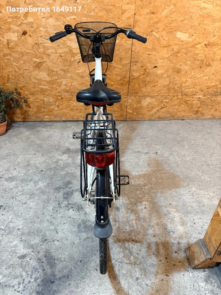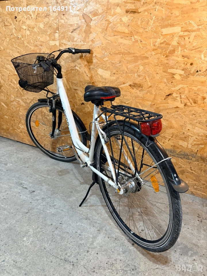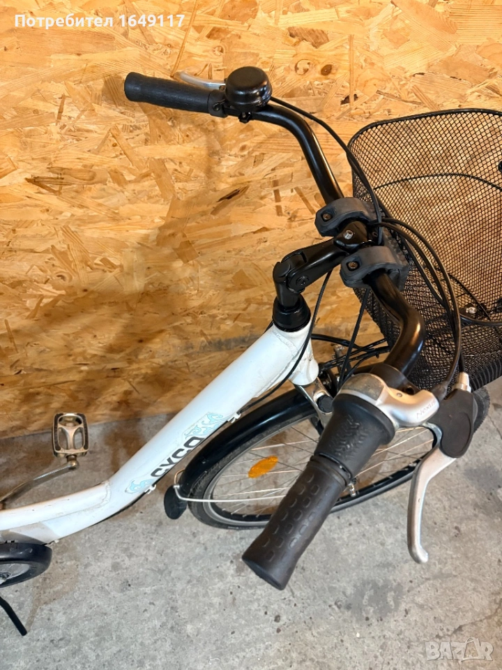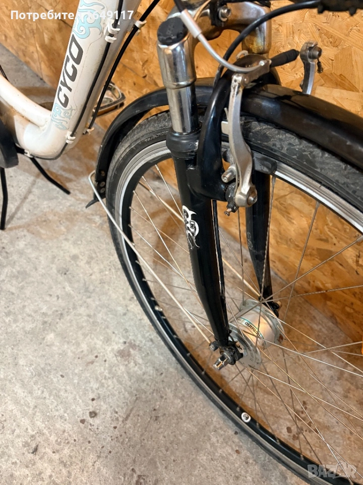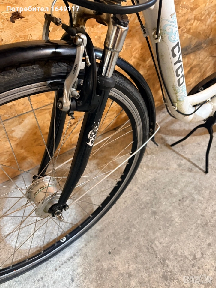 Продавам 28цола, употребяван, дамски-градски велосипед CYCO CITY[made in Germany]. Олекотена, алуминиева рамка - 50см, с ниско прекрачване. Вътрешни скорости Shimano Nexus - 7бр. c revo shift командa Shimano. Предна амортисьорна вилка. Широка, гелова седалка с алуминиево колче. Алуминиеви, двойностенни-капли[предна капла с динамо главина Shimano], и гуми с усилен градски профил. Предна и задна алуминиеви V-break спирачки + контра отзад. Никелирани курбели с алуминиеви педали. Широко градско кормило с алуминиева раздвижна лапа. Заден багажник с натоварване до 25кг + кошница за багаж отпред. Олекотени пластмасови калници, алуминиева двойна-мото стойка, халогенен фар и габаритна светлина, светлоотразители, звънец.