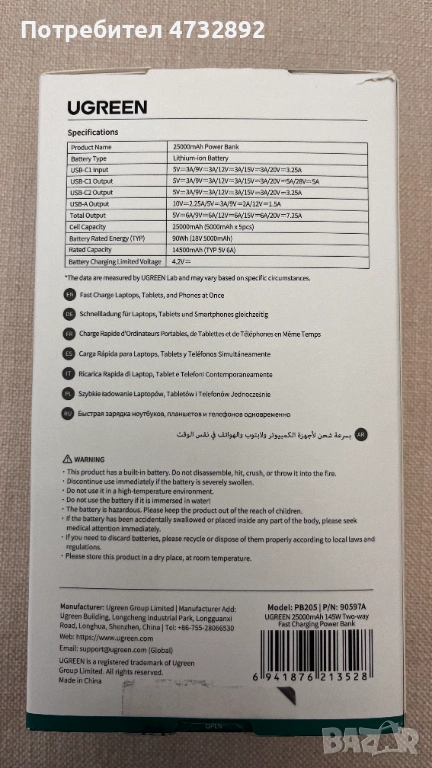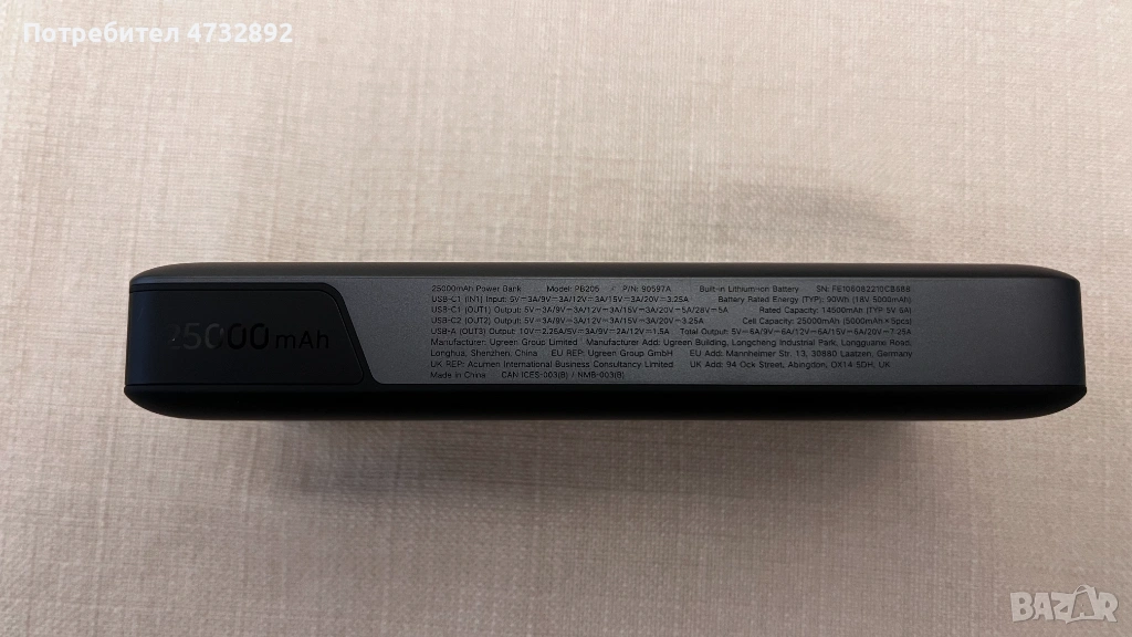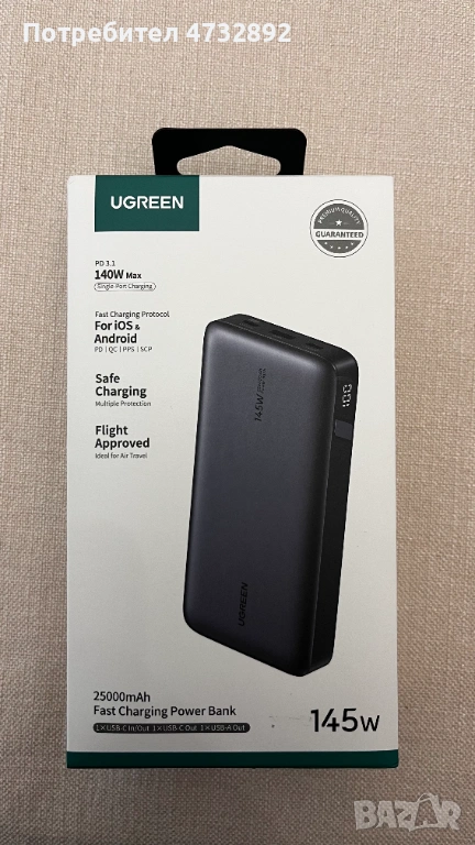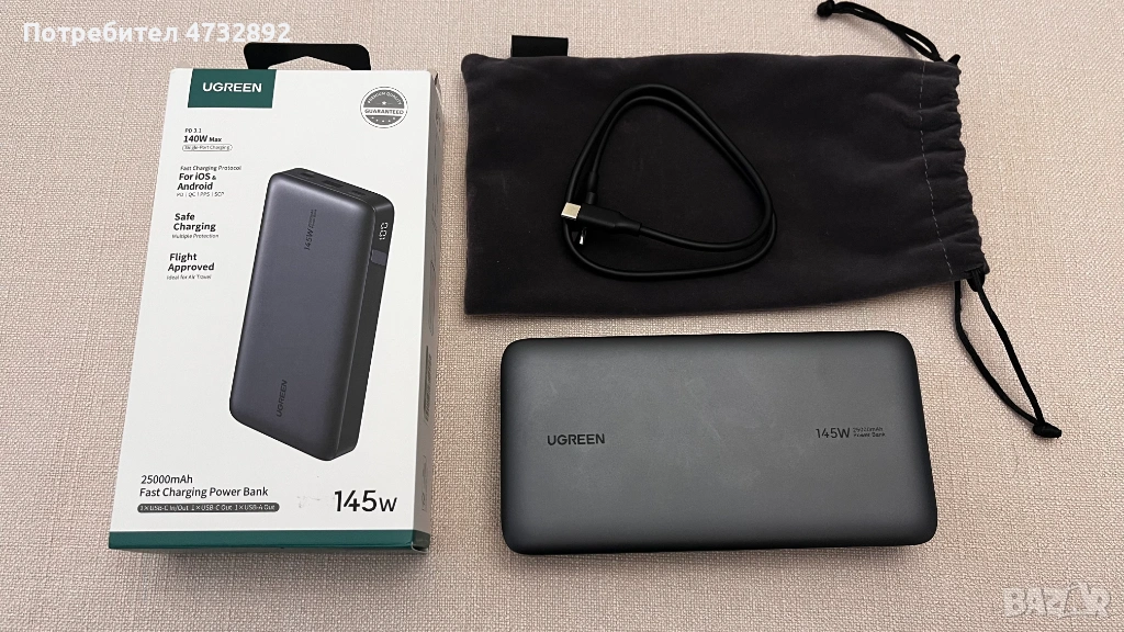 Продавам външна батерия PowerBank Ugreen PB205 145W (модел UG90597A) – мощна и универсална преносима енергийна банка, идеална за пътувания, лаптопи, телефони и други устройства. Използвана е само по време на едно пътуване през ноември 2025 г., с общо 2 цикъла на зареждане, след което е оставена неизползвана.