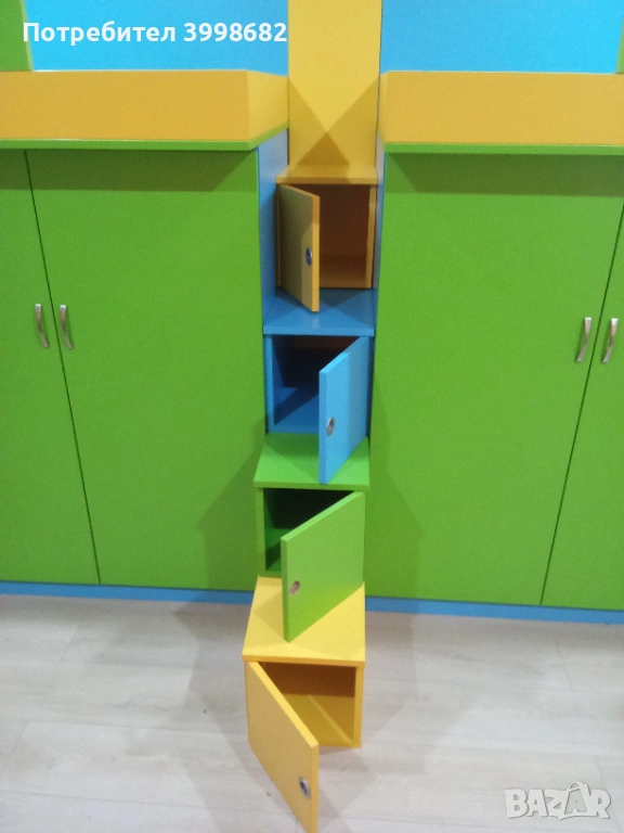 Легла за матрак 82х190 между тях има стълбище 30см.-обща ширина 418см.Височина 130см.
