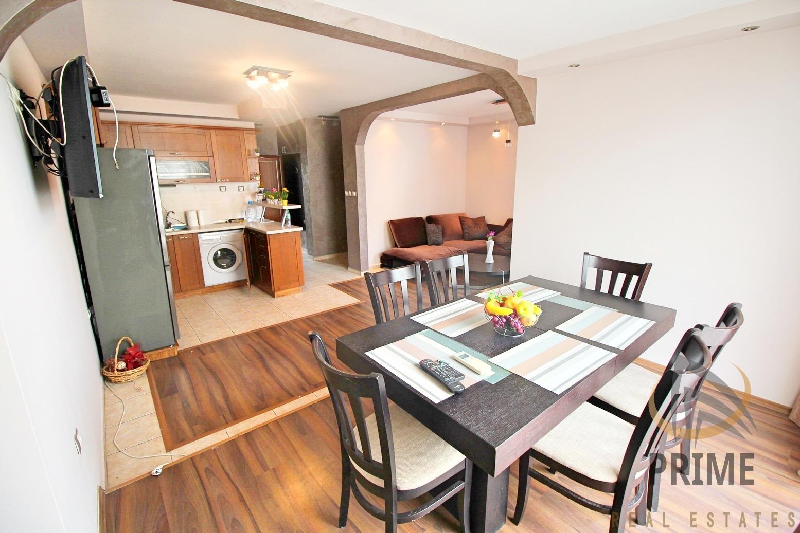 РАЗПРЕДЕЛЕНИЕ: входно антре, просторен хол с обособени трапезна част и кухня, спалня, баня с душкабина и тоалетна, тераса.