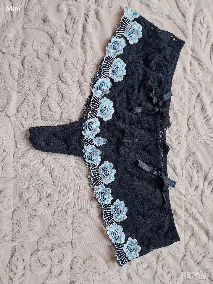 Черна еластична, дантелена полупрашка с бродерия на сини цветя, неразличими от нови.