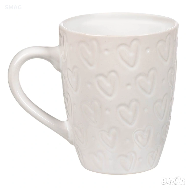 Стилна и елегантна керамична овална чаша в класически бял цвят с релефен дизайн на сърца по цялата повърхност. Деликатната текстура придава изискан и романтичен вид, който прави всяко кафе или чай още по-приятно изживяване.