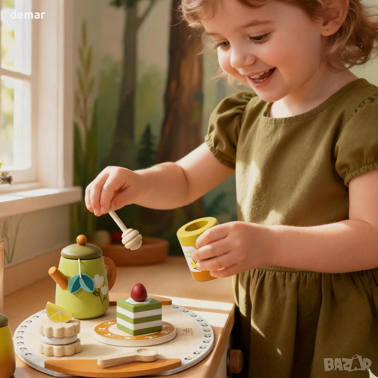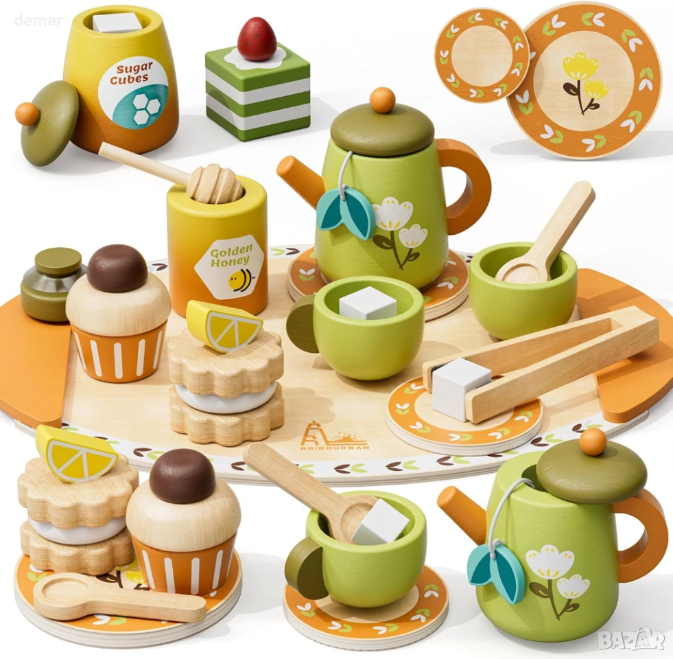 Дървен сервиз за чай, комплект за игра на чай за деца 3+ години