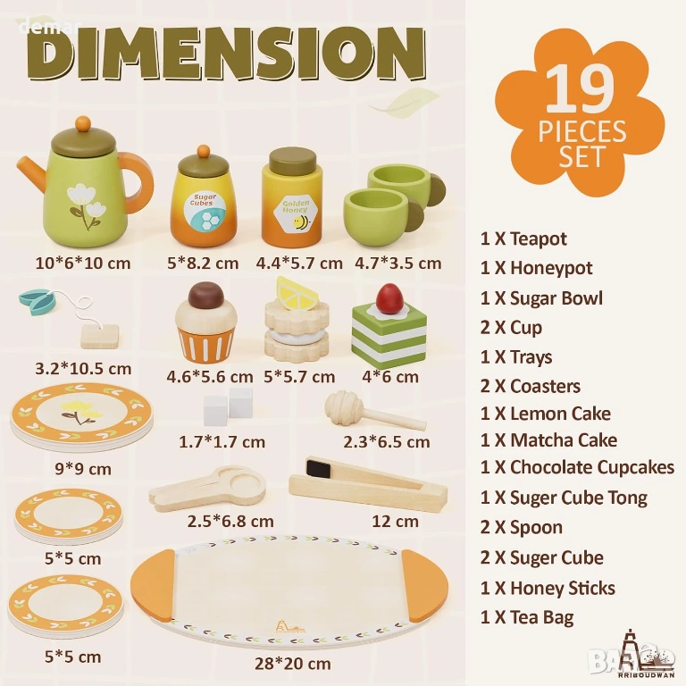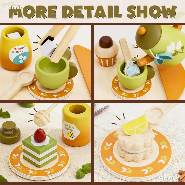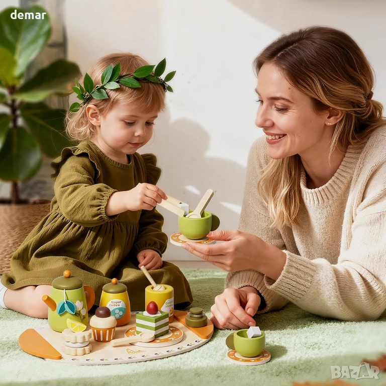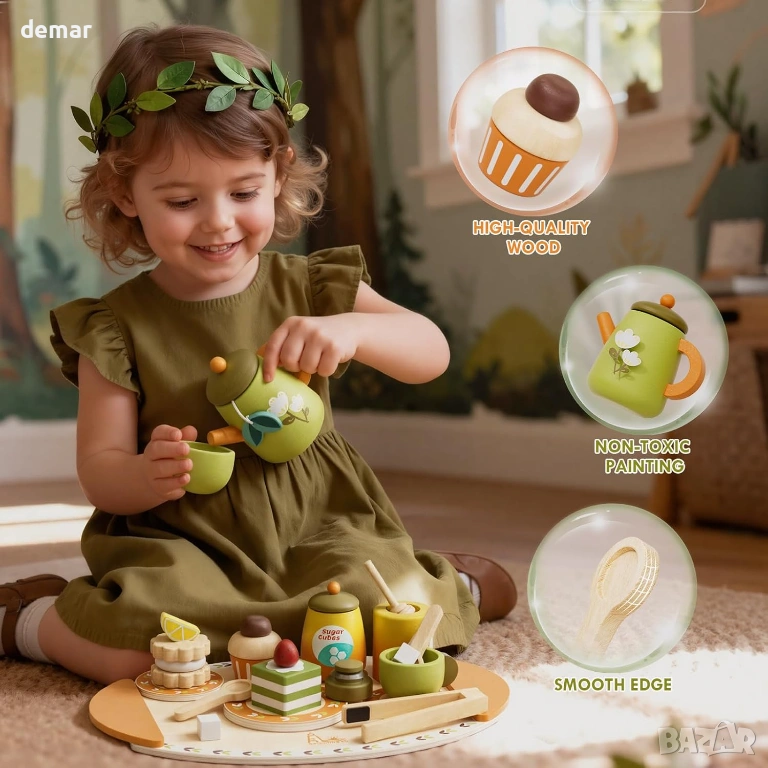 Изработен от здрава дървесина с гладки заоблени ръбове и завършен с нетоксична боя на водна основа, този дървен комплект за чай е проектиран за безопасна и издръжлива игра, с меки зелени и топли оранжеви тонове, подходящи както за игра, така и за показване. Комплектът от 19 части включва очарователни аксесоари като щипки за захарни кубчета, захарни кубчета, пръчици мед и имитиращи лакомства, които насърчават ангажираща ролева игра, помагайки на децата да развият комуникация, споделяне, координация, въображение и ранни когнитивни умения чрез забавление без екрани. Красиво опакован, той е идеален подарък за момчета и момичета на възраст от 2 до 5 години за рождени дни или Коледа.