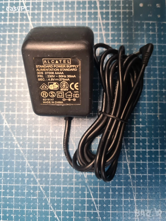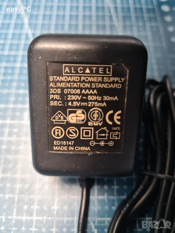 Продавам оригинален захранващ адаптер ALCATEL 07008 AAAA 4.5V 275mA. Адаптера е употребяван, но е напълно функционален и