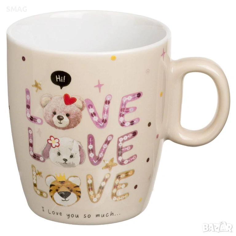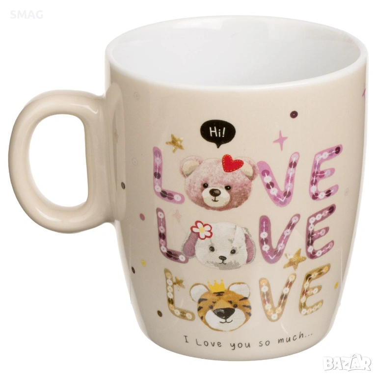 Очарователна мини керамична овална чаша в нежен бежов цвят с цветен печат на кученце, котенце и тигърче, допълнен с романтичното послание „Hi Love, I love you so much“. Дизайнът съчетава сладост и топлина, което я прави идеален подарък за любим човек.