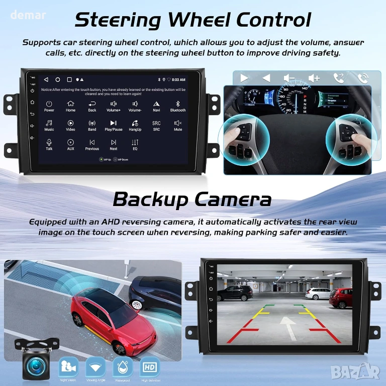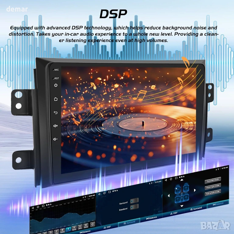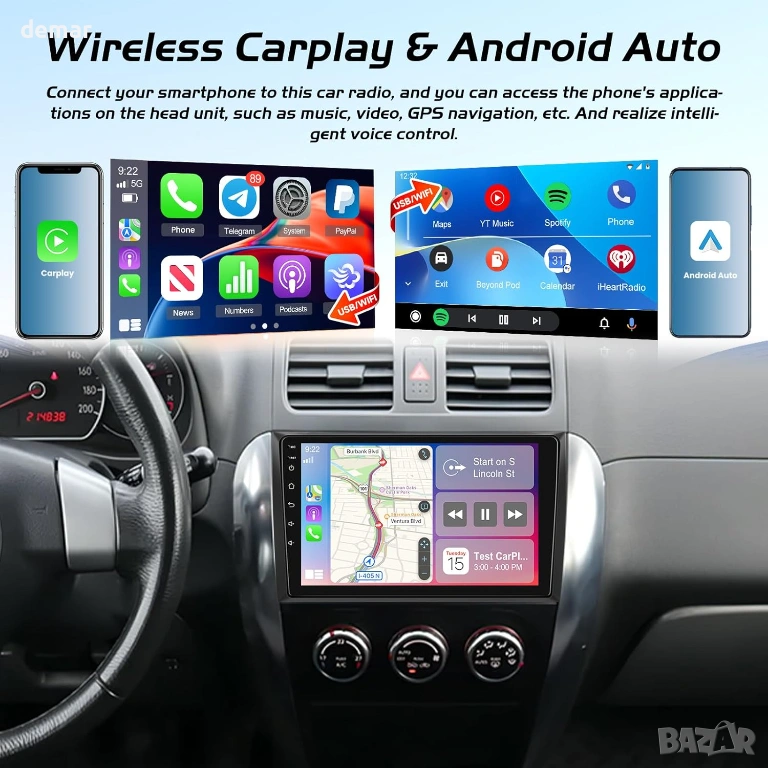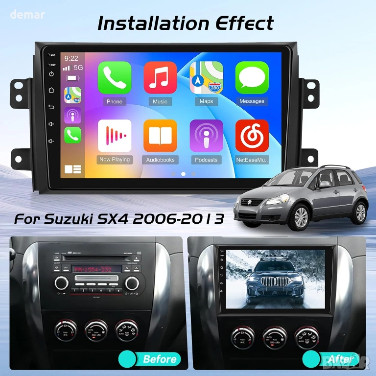 Проектирана за моделите Suzuki SX4 от 2006 до 2013 г., тази вградена стерео система за кола разполага с голям 9-инчов HD сензорен екран с модерна Android система за плавна и бърза работа. Поддържа безжичен CarPlay и Android Auto, което позволява лесен достъп до навигация, разговори, съобщения, музика и гласови асистенти по време на шофиране. Вграденият GPS работи както с онлайн, така и с офлайн карти, а Wi-Fi свързаността позволява изтегляне на приложения, стрийминг и сърфиране в интернет. Усъвършенстваната аудио обработка с регулируеми настройки на еквалайзера подобрява яснотата и дълбочината на звука. Устройството поддържа и оригинални контроли на волана и включва камера за задно виждане, която автоматично показва ясно изображение при движение на заден ход за по-безопасно паркиране.
