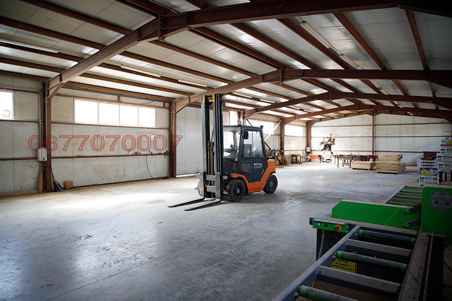 Сграда 1 - Производствено хале за първична обработка със зп от 360кв.м. в него са обособени, склад, компресорно помещение, баня / тоалетна, стая за отдих и офис.