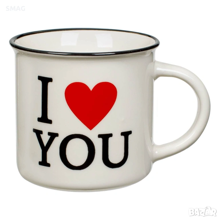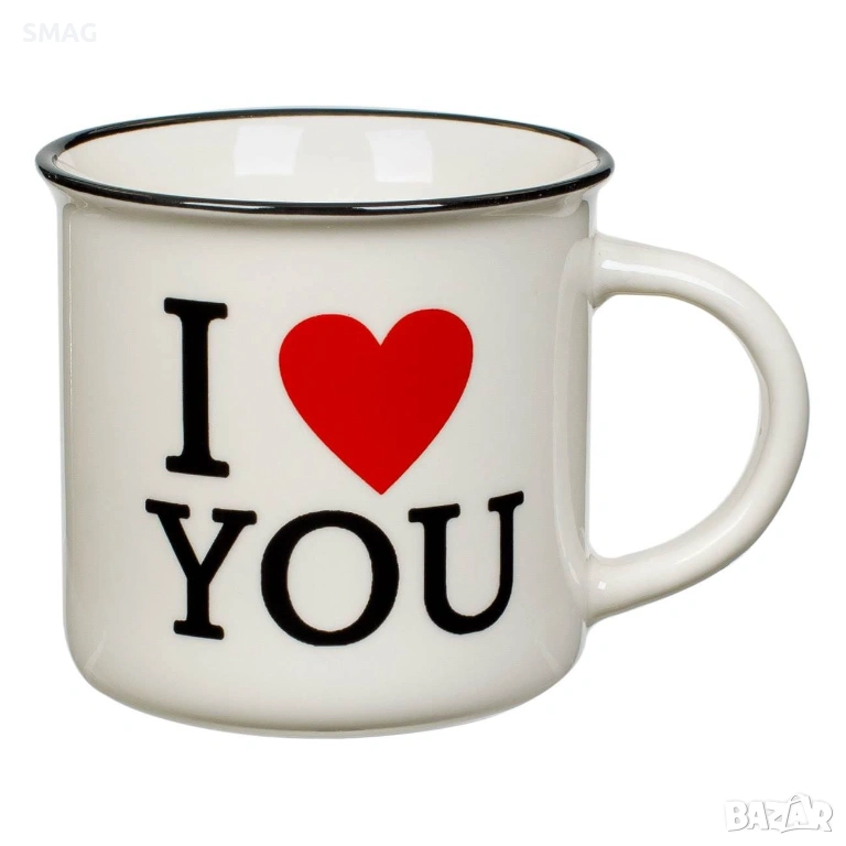 Елегантна права чаша от New Bone в нежен екрю цвят с черен кант и романтичен надпис „I Love You“. Стилен и практичен подарък за Свети Валентин, годишнина или израз на внимание към любим човек. Подходяща за ежедневна употреба с кафе, чай или други топли напитки. Съчетава изчистен дизайн, здравина и комфорт при ползване.