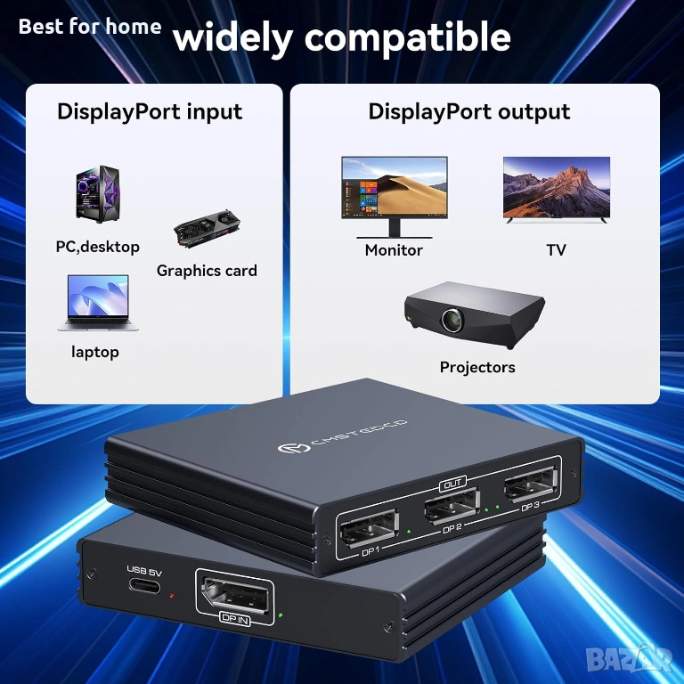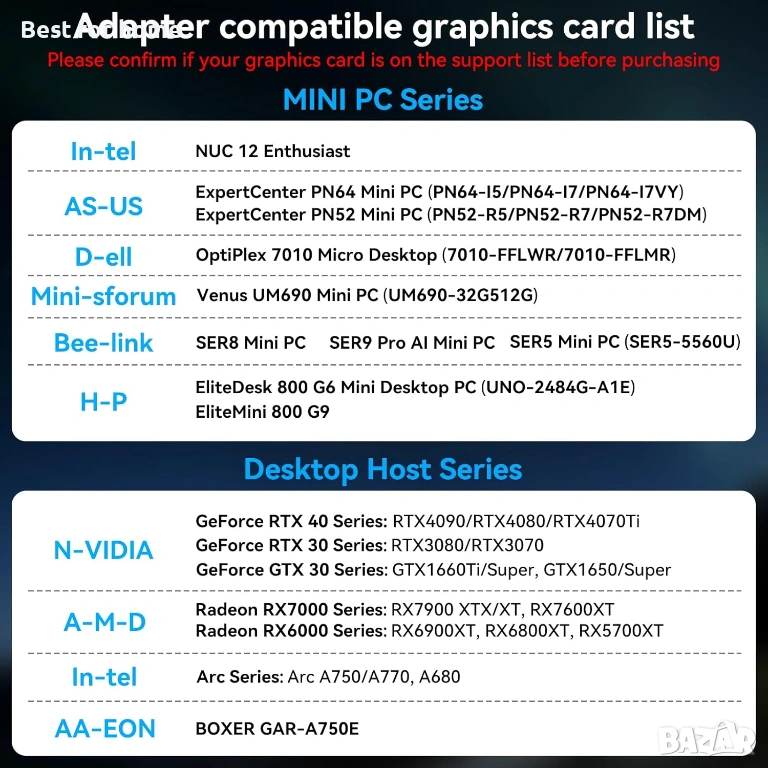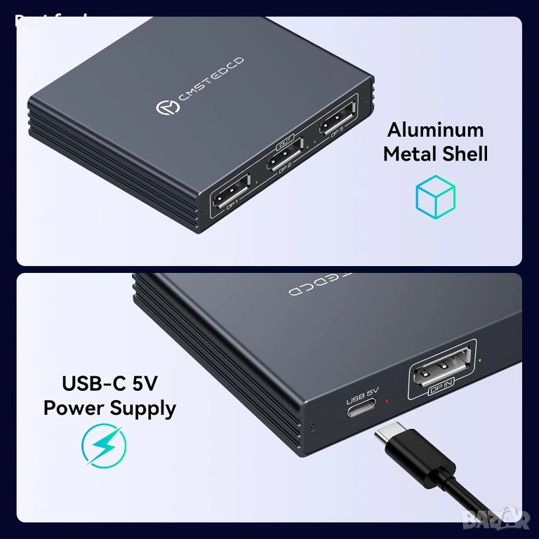 【Моля, проверете съвместимостта】Този сплитер изисква вашият лаптоп да има DP порт или вашият мини компютър и настолен компютър да е от следните модели. мини компютър: Intel NUC 12 Enthusiast, Arc A750/A770/A680, A-SUS ExpertCenter, D-ell OptiPlex, Minisforum Venus, Beelink SER8/SER9 SER5, H-P EliteDesk. Модел на компютърна графична карта: NVI-DIA GeForce RTX/GTX, AM-D Radeon RX7000/RX6000, AAEO-N GAR-A750E. За конкретни съвместими модели, моля, проверете второто основно изображение и второто изображение на описанието на продукта за потвърждение.