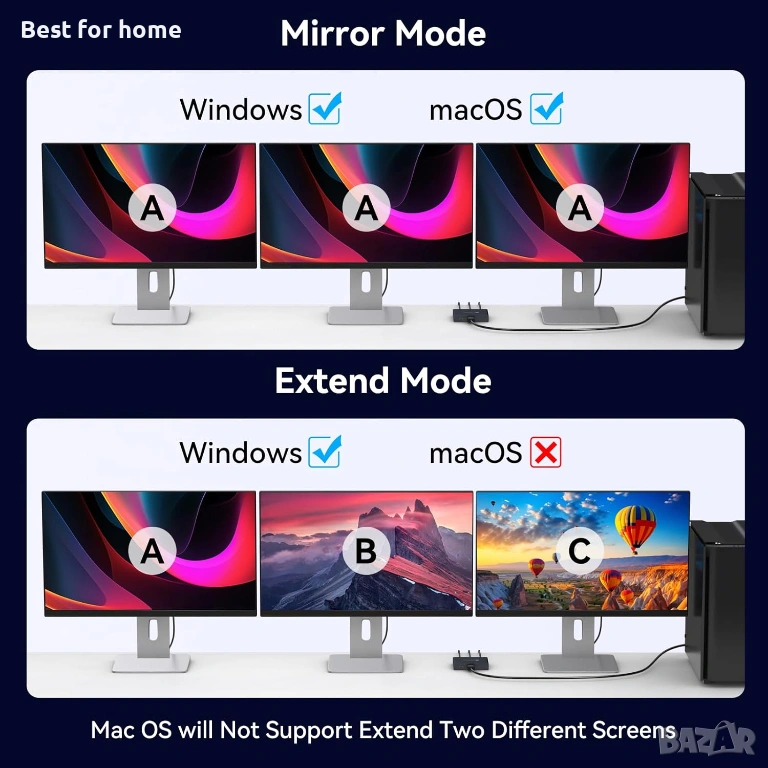 【Режим на разширение и режим на огледало】Този разделител на Display Port за 3 монитора поддържа режим на разширение и режим на огледало. В разширен режим екраните на компютъра и двата монитора могат да показват различни изображения едновременно (ABC); в режим на огледало и двата екрана показват едно и също изображение (AAA/ABB). Забележка: Разширеният режим може да се използва само ако компютърът поддържа MST. Mac OS не може да използва разширения режим поради собственото си ограничение, че поддържа само SST.