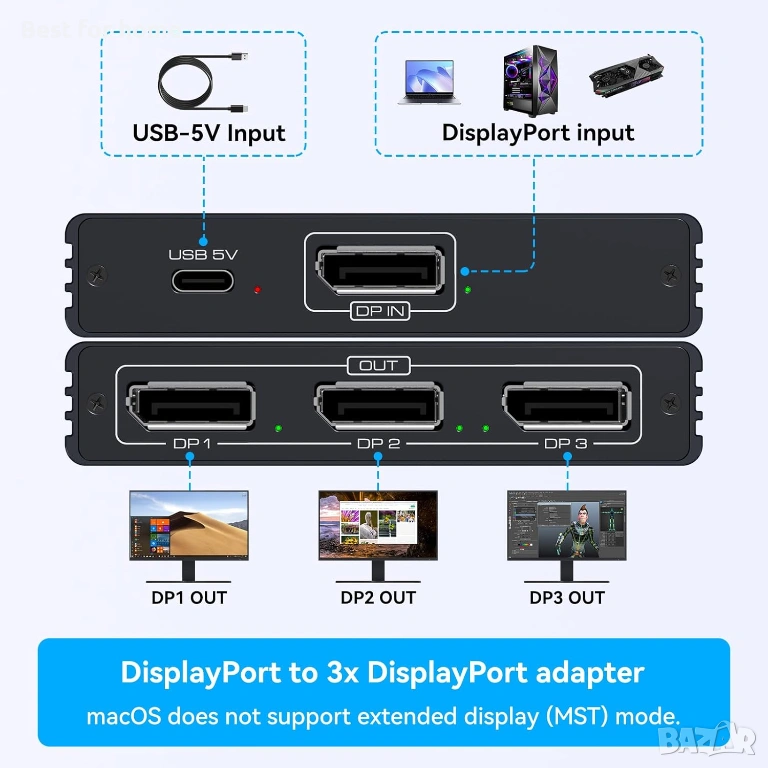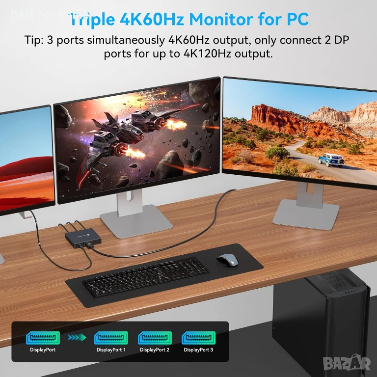 DisplayPort сплитер за 3 монитора 4K60Hz DP за разширен дисплей