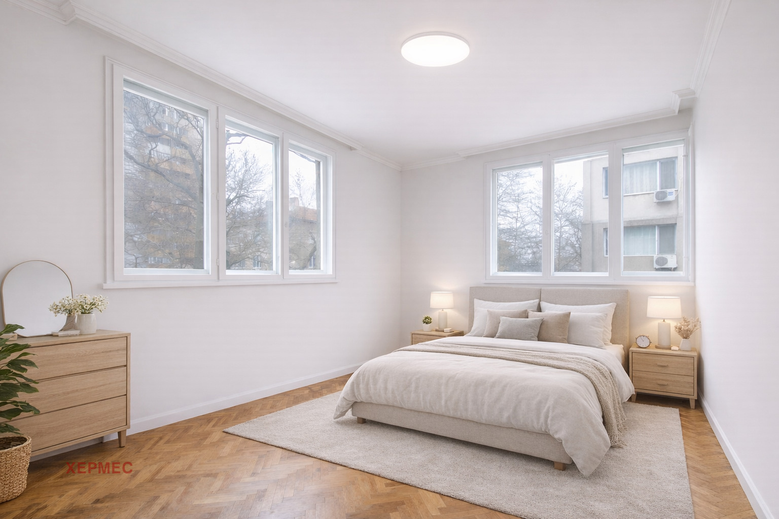 Апартаментът е с изложение изток/запад, което осигурява добра естествена светлина през целия ден.