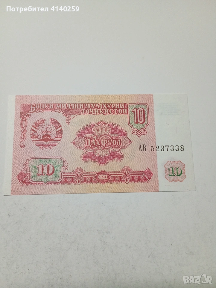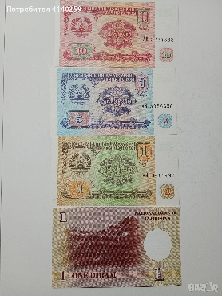 ТАДЖИКИСТАН БАНКНОТИ 1-5-10 РУБЛИ 1994 Г 1 ДИРАМ 1999 Г СЪСТОЯНИЕ НОВО ЦЕНА ЗА 4 БРОЯ ПОЛУЧАВАТЕ СНИМАНИТЕ БАНКНОТИ РАЗГЛЕДАЙТЕ ДРУГИТЕ МИ ОБЯВИ ДА КОМБИНИРАТЕ ДОСТАВКА ЕКОНТ ЗА ВАРНА ЛИЧНО