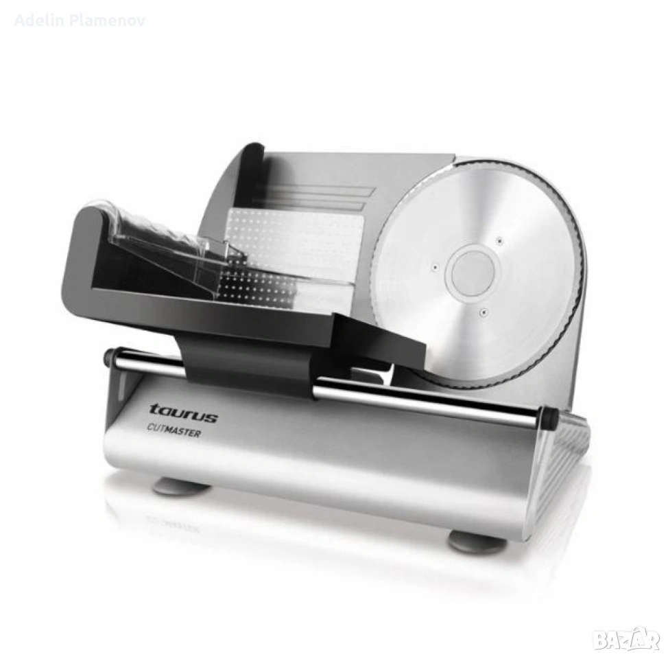 Модел: Taurus CUTMASTER;Тип: Електрически уред за рязане / резач за колбаси, сирена, хляб и др.;Мощност: 150W;Нож: неръждаема стомана, Ø 19 см;Дебелина на среза: регулируема от 1 до 15 мм;Функции: мултифункционален – подходящ за месо, хляб, сирена и зеленчуци;Безопасност: бутон за сигурност, бутало за продуктите;Поддръжка: масата за рязане е сгъваема за лесно почистване;Основа: с вендузи за стабилност;Дизайн: компактен, метално тяло с неръждаема стомана;Препоръчителна употреба: домашна.