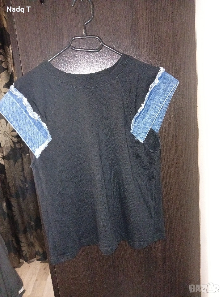 Черна тениска с дънков акцент на ръкавите. Свободен силует. Подходяща и за размер М.