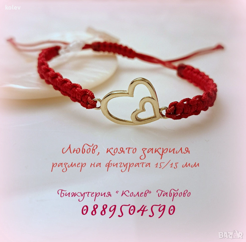 Гривна червен конец с две златни сърца, едно в друго, за споделена обич