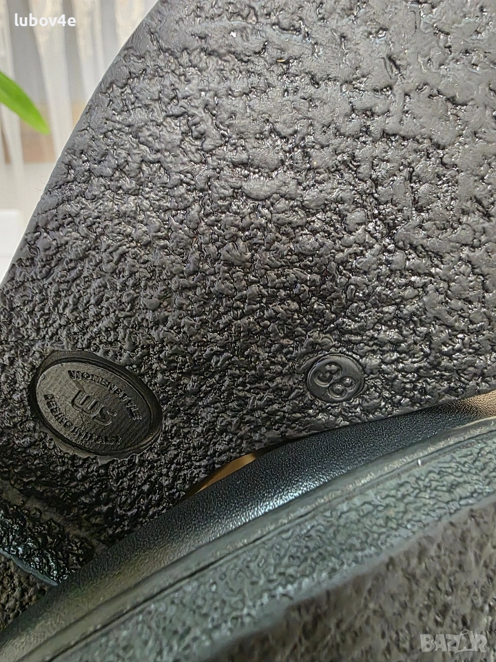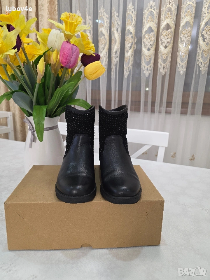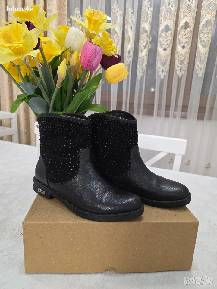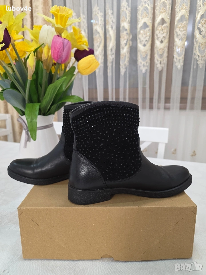 Ботите са от естествена кожа и велур с много хубави камъчета. Обувани са не повече от 3-4 пъти и са в отлично състояние, както можете да видите на снимките. Единствено на едната има отпред лека драскотина, която изобщо не се забелязва. Можете да видите, снимала съм отблизо. Дължина на стелката, измерена от мен 24,7см.