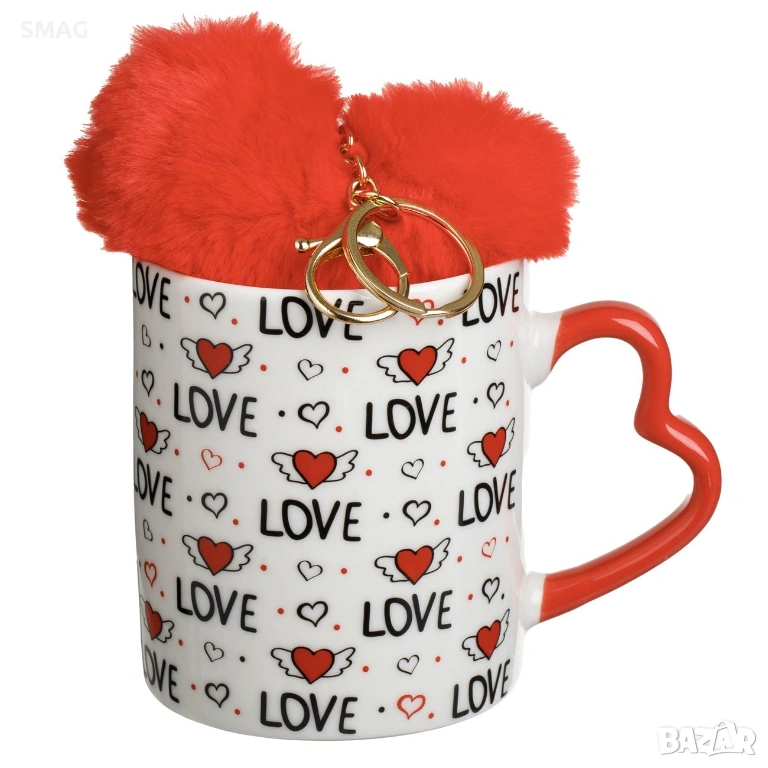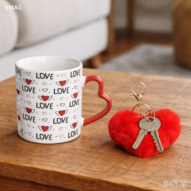 Стилна керамична чаша в бял цвят с дръжка във форма на сърце, декорирана с романтични мотиви и надпис „Love“. Комплектът включва пухкав червен ключодържател сърце със златист метален ринг, което го превръща в идеален подарък за Свети Валентин. Подходящ избор за кафе, чай или топъл шоколад, съчетаващ практичност и емоционално послание.