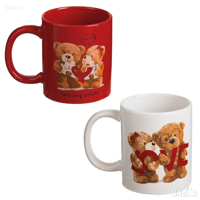 Комплект от две прави керамични чаши в червен и бял цвят с гланцирана повърхност, декорирани със сладки мечета, сърца и надписи „Love“. Идеален комплект за романтични моменти, сутрешно кафе или чай. Отличен подарък за Деня на майката и бащата или за всеки повод, когато искате да покажете любовта си към близките си.