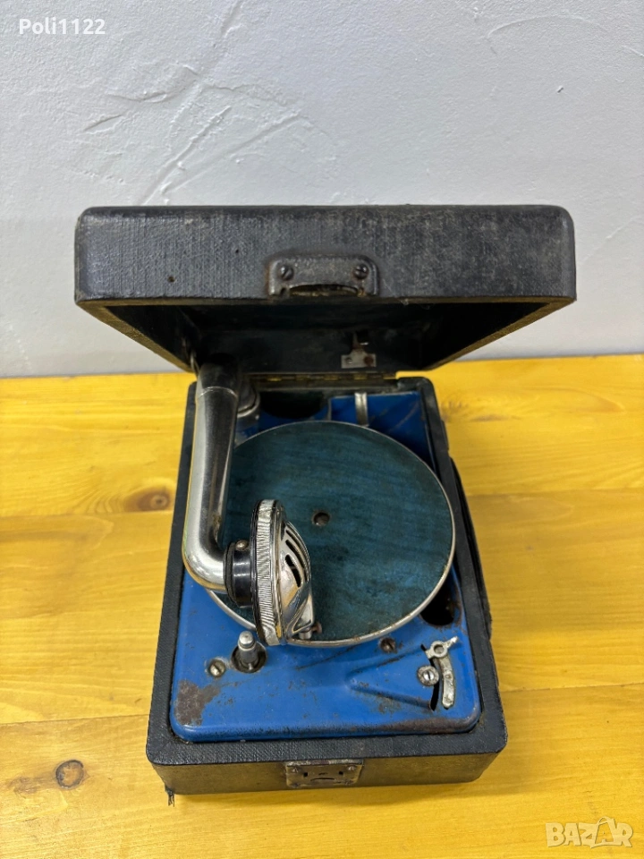 Грамофонът е работещ – механизмът се навива и върти, но не е в идеално козметично състояние. Има видими следи от времето и употреба, които подчертават автентичния винтидж характер.