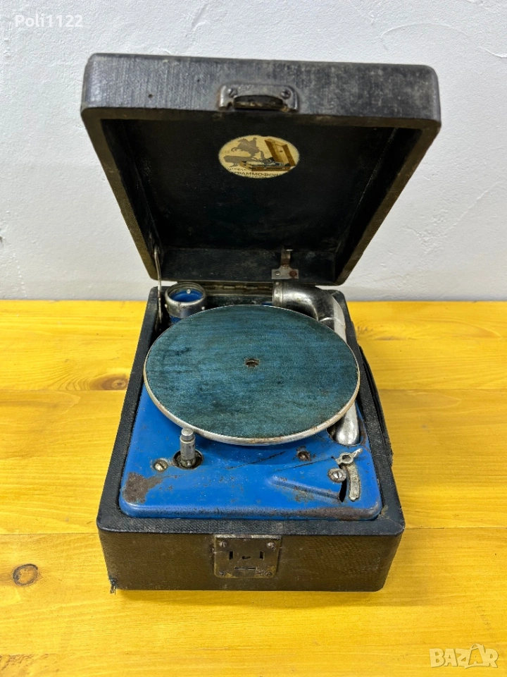 Оригинален миниатурен преносим съветски патефон, произведен от Артель „Граммофон“ – Ленинград, ориентировъчно от края на 40-те / началото на 50-те години.