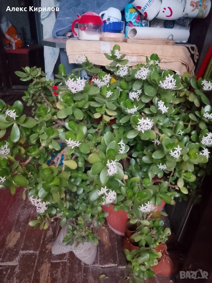 Красиво цъфтящо растение с бели цветове, наречено 'Дървото на живота'. Това е използвано растение, което може да бъде добро допълнение към вашия дом или градина. Растението изглежда здраво и добре поддържано.На първата снимка е моето ,което в момента цъвти бяло. Другите две в по-малките се продават. В момента са отраснали и в момента са над 20см.дължина.